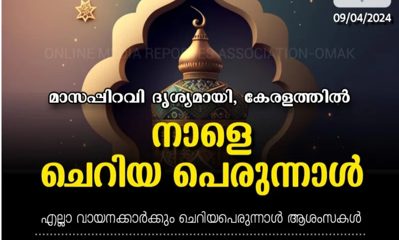 കോഴിക്കോട്: പൊന്നാനിയിൽ ശവ്വാൽ മാസപ്പിറവി കണ്ടതിനാല് നാളെ ചെറിയ പെരുന്നാള് അയിരിക്കുമെന്ന് പാണക്കാട് സാദിഖലി ശിഹാബ് തങ്ങള് അറിയിച്ചു. മാസപിറവി കണ്ടതായി കോഴിക്കോട് ഖാസി മുഹമ്മദ് കോയ ജമലുലൈലി തങ്ങളും നാളെ ചെറിയ പെരുന്നാൾ ആയിരിക്കുമെന്ന് കോഴിക്കോട് മുഖ്യ ആക്ടിങ്ങ് ഖാസി സഫീർ സഖാഫിയും അറിയിച്ചു. പൊന്നാനിയിൽ മാസപ്പിറവി കണ്ട സാഹചര്യത്തിൽ നാളെ ഈദുൽ ഫിത്വർ (ചെറിയപെരുന്നാൾ ) ആയിരിക്കുമെന്ന് കേരള ഹിലാൽ (കെഎൻഎം) കമ്മിറ്റി ചെയർമാൻ എം മുഹമ്മദ് മദനിയും അറിയിച്ചു.ഇതോടെ ഒരു മാസം നീണ്ട വ്രതാനുഷ്ഠാനങ്ങൾക്ക് ശേഷം വിശ്വാസി സമൂഹം ആഘോഷത്തിലേക്ക് കടക്കുകയാണ്. ചെറിയ പെരുന്നാളിനോട് അനുബന്ധിച്ച് പള്ളികളിൽ പ്രത്യേക പ്രാര്ത്ഥനകൾ നടക്കും.