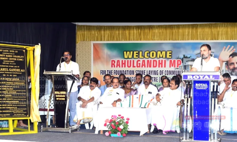 കോടഞ്ചേരി:രാഹുൽ ഗാന്ധി എം.പി കോടഞ്ചേരി സെന്റ് ജോസഫ് ഹയർ സെക്കൻഡറി സ്കൂൾ ഓഡിറ്റോറിയത്തിൽ എം.പി ഫണ്ടിൽ നിന്ന് 55 ലക്ഷം രൂപ ചെലവഴിച്ച് കോടഞ്ചേരി കുടുംബാരോഗ്യ കേന്ദ്രത്തിൽ പുതുതായി നിർമ്മിക്കുന്ന കമ്മ്യൂണിറ്റി ഡിസബിലിറ്റി മാനേജ്മെന്റ് സെന്റർ (സി.ഡി.എം.സി)റിന്റെ തറകല്ലിടൽ കർമ്മം നിർവഹിച്ചു. ഭിന്നശേഷിക്കാർക്കായി ഈ സ്ഥാപനം തുടക്കം കുറിക്കാൻ കഴിഞ്ഞതിൽ ഞാൻ അഭിമാനം കൊള്ളുന്നു എല്ലാ മനുഷ്യർക്കും എന്തെങ്കിലും പോരായ്മകൾ ഉണ്ട് അതിനെ പരിപോഷിപ്പിക്കേണ്ടത് സമൂഹത്തിന്റെ കടമയാണ് വയനാട്ടിലുള്ള സാധാരണക്കാർക്ക് ഇങ്ങനെയുള്ള കാര്യങ്ങളിൽ പ്രതിബദ്ധത കൂടുതലാണ് എന്ന് അദ്ദേഹം പറഞ്ഞു .