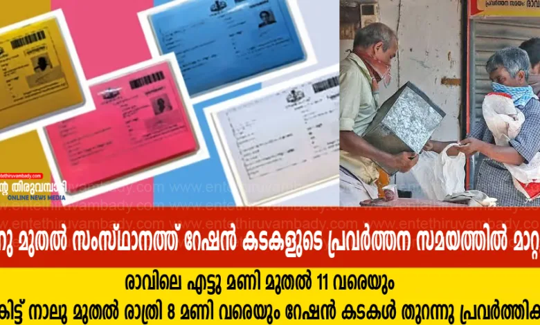 ഇന്നു (2024 മെയ് 3) മുതൽ റേഷൻ കടകളുടെ പ്രവർത്തനം രാവിലെ എട്ടുമണി മുതൽ 11 മണി വരെയും വൈകിട്ട് നാലുമണി മുതൽ രാത്രി എട്ടുമണി വരെയും തുറന്നു പ്രവർത്തിക്കുമെന്ന് അധികൃതർ അറിയിച്ചു.