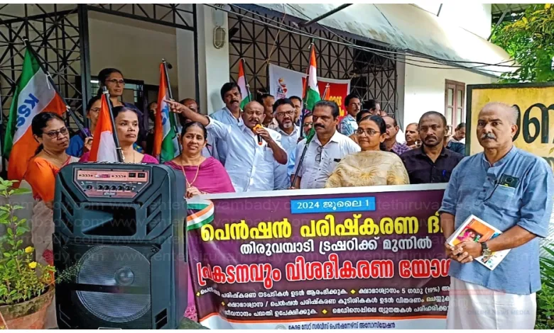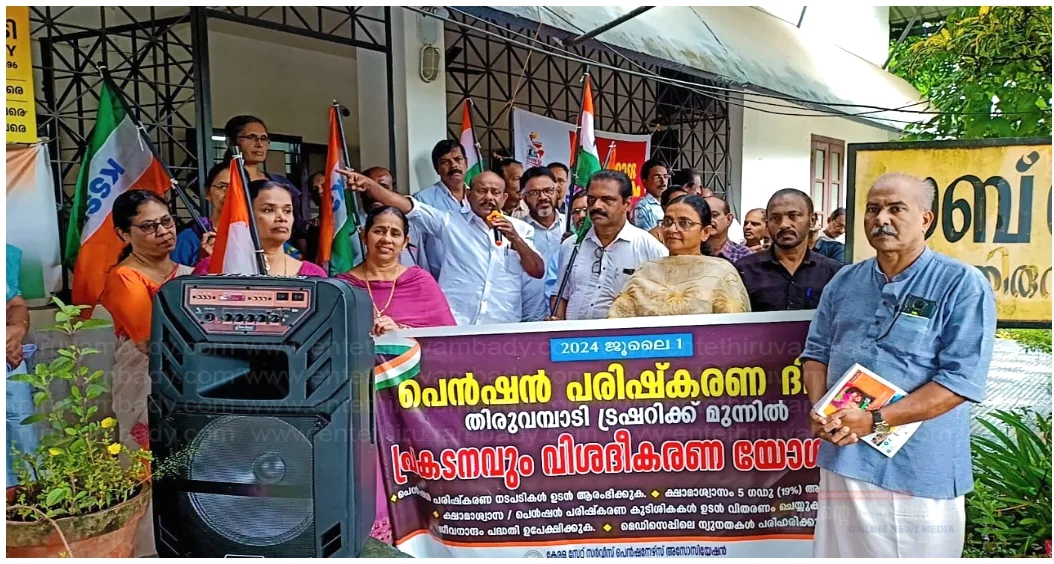 തിരുവമ്പാടി:പെൻഷൻ പരിഷ്കരണ നടപടികൾ ഉടൻ ആരംഭിക്കുക, ക്ഷാമാശ്വാസം 6 ഗഡു (19 ശതമാനം) അനുവദിക്കുക, ക്ഷാമാശ്വാസ/ പെൻഷൻ പരിഷ്കരണ കുടിശികകൾ ഉടനെ വിതരണം ചെയ്യുക, ജീവാനന്ദം പദ്ധതി ഉപേക്ഷിക്കുക, മെഡിസാപ്പിലെ ന്യൂനതകൾ പരിഹരിക്കുക എന്നീ ആവശ്യങ്ങൾ ഉന്നയിച്ച് കൊണ്ട് കേരള സ്റ്റേറ്റ് സർവീസ് പെൻഷനേർസ് അസോസിയേഷൻ സംസ്ഥാന വ്യാപകമായി മുഴുവൻ ട്രഷറികൾക്ക് മുന്നിലും നടത്തുന്നതിൻ്റെ ഭാഗമായി പ്രതിഷേധ ധർണയും വിശദീകരണയോഗവും തിരുവമ്പാടി കെ.എസ്.എസ്.പി.എ മണ്ഡലം കമ്മറ്റിയുടെ നേതൃത്വത്തിൽ തിരുവമ്പാടി സബ് ട്രഷറി ഓഫീസിന് മുന്നിലും സംഘടിപ്പിച്ചു. ജില്ലാ കോൺഗ്രസ് കമ്മറ്റി ജനറൽ സെക്രട്ടറി ബാബു പൈക്കാട്ടിൽ ധർണ ഉൽഘാടനം ചെയ്തു. കെ. എസ്.എസ്. പി.എ തിരുവമ്പാടി മണ്ഡലം പ്രസിഡണ്ട് ജോൺസൺ പുത്തൂരിൻ്റെ അദ്ധ്യക്ഷതയിൽ ചേർന്ന യോഗത്തിൽ ഗ്രാമ പഞ്ചായത്ത് പ്രസിഡണ്ട് ബിന്ദു ജോൺസൺ, ജില്ലാപഞ്ചായത്ത് മെമ്പർ ബോസ് ജേക്കബ്, കോൺഗ്രസ് മണ്ഡലം പ്രസിഡണ്ട് മനോജ് വാഴേ പറമ്പിൽ, മഹിളാ കോൺഗ്രസ് നേതാവ് മില്ലിമോഹൻ, കെ.എസ്.എസ് പി.എ ഭാരവാഹികളായ സുന്ദരൻ എ. പ്രണവം, അനിൽകുമാർ പൈക്കാട്ടിൽ, കെ.പി. സാദിഖലി, അഗസ്റ്റിൻ മഠത്തിപ്പറമ്പിൽ, ദേവസ്യ ചൊള്ളാമഠം, റോയ് ജോസഫ് പന്തപ്പിള്ളിൽ, കെ.ഐ. ലെയ്സമ്മ, കെ.ടി.ത്രേസ്യ, വി.എം.ഗംഗാ ദേവി, റോബർട്ട് ജോർജ്, മേഴ്സി ജോസഫ് പുത്തൻപുരയിൽ എന്നിവർ സംസാരിച്ചു.സുന്ദരൻ എ പ്രണവംസെക്രട്ടറി