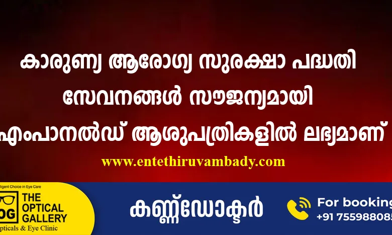 സംസ്ഥാന ആരോഗ്യ വകുപ്പിനു കീഴിൽ പ്രവർത്തിക്കുന്ന സ്റ്റേറ്റ് ഹെൽത്ത് ഏജൻസി (എസ്.എച്ച്.എ) യിലൂടെ നടപ്പിലാക്കുന്ന ആയുഷ്മാൻ ഭാരത് പ്രധാനമന്ത്രി ജൻ ആരോഗ്യ യോജന – കാരുണ്യ ആരോഗ്യ സുരക്ഷാ പദ്ധതി ഗുണഭോക്താക്കൾക്ക് സമഗ്ര ആരോഗ്യ പരിരക്ഷ ഉറപ്പാക്കുന്ന പദ്ധതിയാണ്. പദ്ധതിയിൽ തെരഞ്ഞെടുക്കപ്പെട്ട ആശുപത്രികളിലൂടെയാണ് സൗജന്യ ചികിത്സ ലഭ്യമാക്കി വരുന്നത്. പദ്ധതിയെക്കുറിച്ച് കൂടുതൽ വിവരങ്ങൾക്ക് ദിശ ടോൾ ഫ്രീ നമ്പറുകളായ 1056/ 104 ൽ ബന്ധപ്പെടാം.
