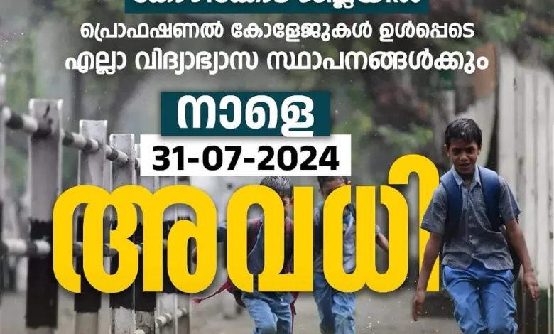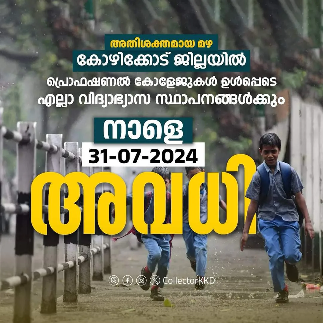 കോഴിക്കോട്: നാളെ 31- 07 – 2024 കോഴിക്കോട് ജില്ലയിലെ സ്കൂളുകൾക്ക് അവധികോഴിക്കോട് ജില്ലയിൽ മഴ ശക്തമായി തുടരുന്നസാഹചര്യത്തിൽ, ജില്ലയിലെ എല്ലാ സ്കൂളുകൾക്കും നാളെ (31-07-2024) അവധി പ്രഖ്യാപിച്ചതായി കലക്ടർ അറിയിച്ചു. ജില്ലയിലെ അങ്കണവാടികള്ക്കും അവധി ബാധകമാണ്.മഴക്കാല മുന്നറിയിപ്പുകൾക്ക് ആധികാരിക സ്രോതസ്സുകൾ മാത്രം ആശ്രയിക്കുകഅടിയന്തിര ഘട്ടങ്ങളിൽ ടോൾ ഫ്രീ നമ്പർ 1077 ഉപയോഗപ്പെടുത്തുക