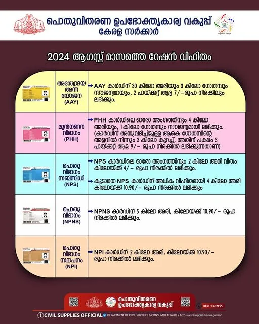 2, എല്ലാ വിഭാഗം റേഷൻ കാർഡുകൾക്കും അനുവദിച്ചിട്ടുള്ള, 2024 ആഗസ്റ്റ് മാസത്തെ റേഷൻ വിഹിതം സംബന്ധിച്ച വിവരങ്ങൾ ചുവടെയുള്ള ചിത്രത്തിൽ ഉൾപ്പെടുത്തിയിരിക്കുന്നു…