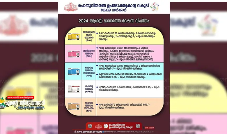 1, 2024 ആഗസ്റ്റ് മാസത്തെ റേഷൻ വിതരണം 05.08.2024 (തിങ്കളാഴ്ച) മുതൽ ആരംഭിക്കുന്നതാണ്.