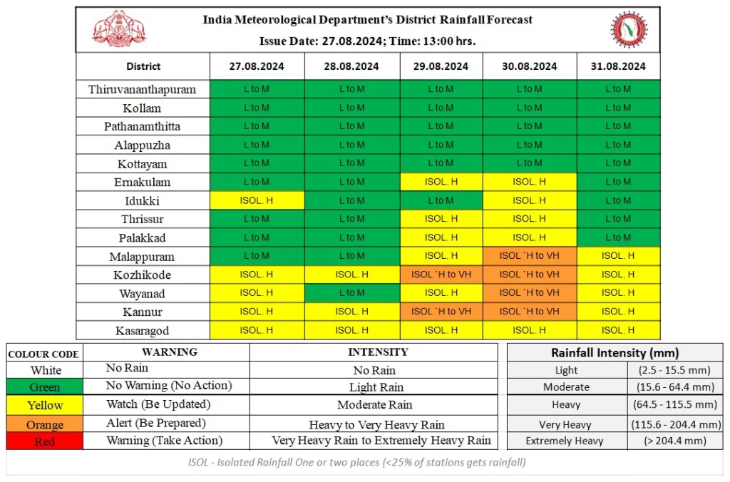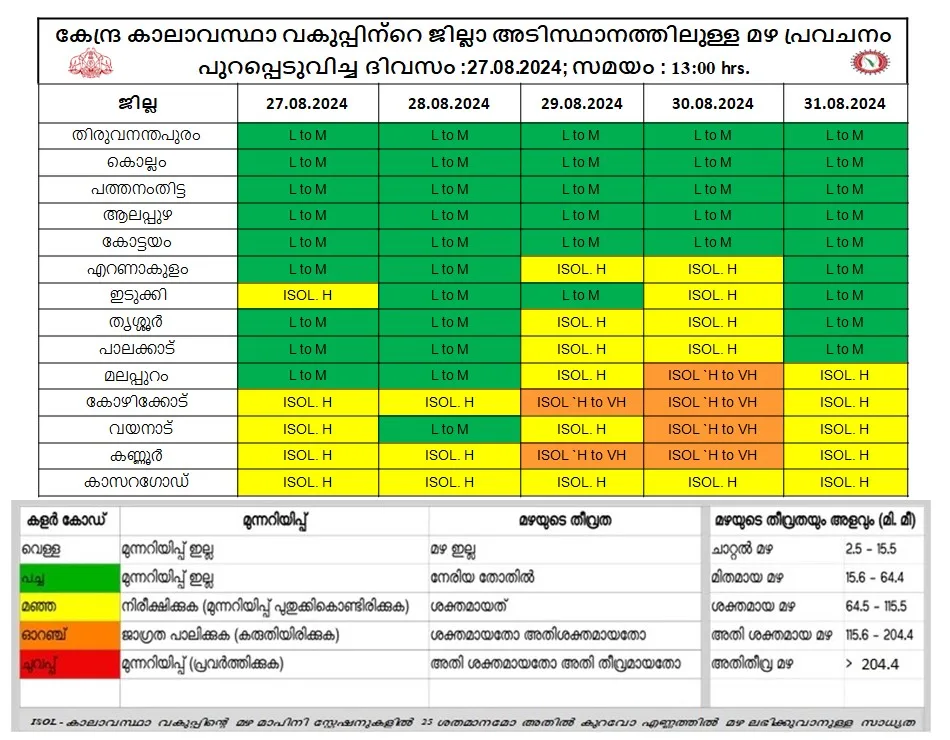 സംസ്ഥാനത്ത് ഇന്ന് ഇടുക്കി, കോഴിക്കോട്, വയനാട്, കണ്ണൂർ, കാസർകോട് ജില്ലകളിൽ യെല്ലോ അലർട്ടാണ്. മറ്റെല്ലാ ജില്ലകളിലും മഴ പെയ്യാൻ നേരിയ സാധ്യതയുണ്ട്. നാളെ കോഴിക്കോട്, കണ്ണൂർ, കാസർകോട് ജില്ലകളിൽ മഴയ്ക്ക് സാധ്യതയുണ്ട്. അതേസമയം ഓഗസ്റ്റ് 29 ന് എറണാകുളം, തൃശ്ശൂർ, പാലക്കാട്, മലപ്പുറം, വയനാട്, കാസർകോട് ജില്ലകളിൽ യെല്ലോ അലർട്ട് പുറപ്പെടുവിച്ചിട്ടുണ്ട്. കോഴിക്കോട് കണ്ണൂർ ജില്ലകളിൽ ഓറഞ്ച് അലർട്ടാണ്.ഓഗസ്റ്റ് 30 ന് മലപ്പുറം, കോഴിക്കോട്, വയനാട്, കണ്ണൂർ ജില്ലകളിൽ ഓറഞ്ച് അലർട്ടാണ് പുറപ്പെടുവിച്ചിരിക്കുന്നത്. എറണാകുളം, ഇടുക്കി, തൃശ്ശൂർ, പാലക്കാട്, കാസർകോട് ജില്ലകളിൽ യെല്ലോ അലർട്ടാണ്. ഓഗസ്റ്റ് 31 ന് മലപ്പുറം, കോഴിക്കോട്, വയനാട്, കണ്ണൂർ, കാസർകോട് ജില്ലകളിൽ യെല്ലോ അലർട്ടാണ് പുറപ്പെടുവിച്ചിരിക്കുന്നത്