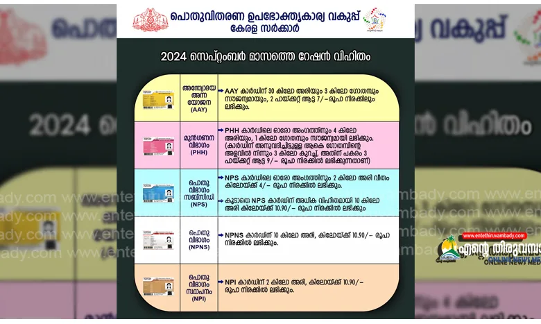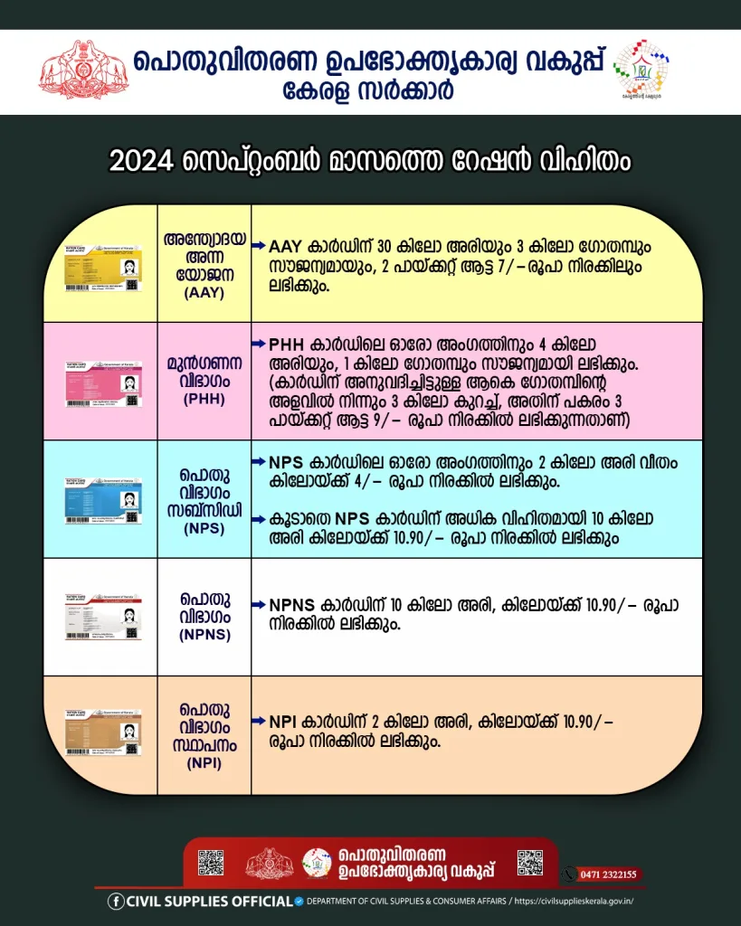 4, എല്ലാ വിഭാഗം റേഷൻ കാർഡുകൾക്കും അനുവദിച്ചിട്ടുള്ള, 2024 സെപ്റ്റംബർ മാസത്തെ റേഷൻ വിഹിതം ചുവടെയുള്ള ചിത്രത്തിൽ ഉൾപ്പെടുത്തിയിരിക്കുന്നു…