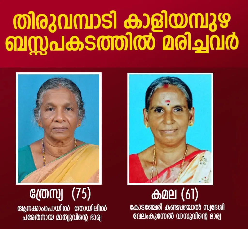 തിരുവമ്പാടി :തിരുവമ്പാടി പുല്ലൂരാംപാറ റോഡിലെ കാളിയമ്പുഴയിൽ കെഎസ്ആർടിസി ബസ് പുഴയിലേക്ക് മറിഞ്ഞുണ്ടായ അപകടത്തിൽരണ്ട് സ്ത്രീകൾ മരിച്ചു.കോടഞ്ചേരി കണ്ടപ്പഞ്ചാല് വേലംകുന്നേൽ വാസുവിന്റെ ഭാര്യ കമല (61), ആനക്കാംപൊയിൽ പടിഞ്ഞാറക്കര തോയിലിൽ ത്രേസ്യ (75 ) എന്നിവരാണ് മരിച്ചത്.