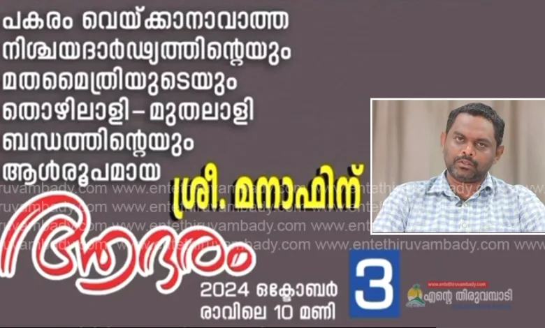 മുക്കം: അർജുന് വേണ്ടി തരളാതെ പൊരുതിയ പച്ചയായ മനുഷ്യസ്നേഹിയും പകരം വയ്ക്കാനാകാത്ത നിശ്ചയദാർഢ്യത്തിൻ്റെയും മതമൈത്രിയുടെയും തൊഴിലാളി മുതലാളി ബന്ധത്തിൻ്റെയും ആൾരൂപവുമായ മനാഫിനെ മുക്കം ഹയർ സെക്കണ്ടറി സ്കൂൾ നാളെ (03.10.2024 ) രാവിലെ 10 മണിക്ക് മുക്കം ഹയർ സെക്കണ്ടറി സ്കൂളിൽ വച്ച് ആദരിക്കുന്നു.കൂടാതെ ഷിരൂരിൽ അർജുന് വേണ്ടി തിരച്ചിലിന് നേതൃത്വം നൽകിയ വിവിധ സന്നദ്ധ സംഘടനകളിലെ വളണ്ടിയേഴ്സിനെയും ചടങ്ങിൽ ആദരിക്കും.പരിപാടിയിൽ സാമൂഹ്യ,സാംസ്കാരിക, രാഷ്ട്രീയ, വിദ്യാഭ്യാസ, സേവന മേഖലകളിലെ പ്രമുഖർ പങ്കെടുക്കും.