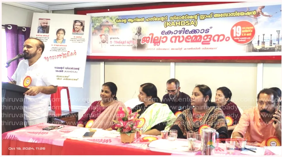 കോഴിക്കോട് : ക്ഷീര, മാംസ, മുട്ട ഉൽപ്പാദന മേഖലകളിൽ രാജ്യത്ത് തന്നെ ഏറ്റവും വലിയ വളർച്ചാനിരക്ക് നേടുന്ന നിലയിലേക്ക് മൃഗസംരക്ഷണ വകുപ്പും അതിനു കീഴിലെ അനുബന്ധ സ്ഥാപനങ്ങളും നടത്തുന്ന പ്രവർത്തനങ്ങൾ അഭിനന്ദനാ ർഹമാണെന്ന് ജോയിന്റ് കൗൺസിൽ സംസ്ഥാന വൈസ് പ്രസിഡന്റ് നരേഷ്കുമാർ കുന്നിയൂർ അഭിപ്രായപ്പെട്ടു. മൃഗസംരക്ഷണ മേഖലയെ കൂടുതൽ ശക്തിപ്പെടുത്തുന്നതിലേക്കായി ജീവനക്കാരെ ഒപ്പം നിർത്തി മുന്നോട്ടുപോകാൻ വകുപ്പിൽ നവീകരണ പ്രവൃത്തികൾ ഇനിയും തുടരേണ്ടതുണ്ടെന്ന് അദ്ദേഹം കൂട്ടിച്ചേർത്തു. കേരള മൃഗസംരക്ഷണ വകുപ്പ് സ്റ്റാഫ് അസോസിയേഷന്റെ (കെ.എ.എച്ച്.ഡി.എസ്. എ) കോഴിക്കോട് ജില്ലാ സമ്മേളനം ഉദ്ഘാടനം ചെയ്തു കൊണ്ട് സംസാരിക്കുകയായിരുന്നു അദ്ദേഹം. ജീവനക്കാരുടെ ആനുകൂല്യങ്ങൾ സമയബന്ധിതമായി നൽകണമെന്നും മൃഗസംരക്ഷണ വകുപ്പിൽ താഴെ തട്ടിലുള്ള ജീവനക്കാർക്ക് സർക്കാർ ഉത്തരവിലൂടെഅനുവദിച്ച പ്രൊമോഷൻ ക്വാട്ട അടിയന്തരമായി നടപ്പിലാക്കണമെന്നും അദ്ദേഹം ആവശ്യപ്പെട്ടു. കൂടാതെ പണം കൊടുത്തു സേവനം കൈപ്പറ്റി എന്ന് ആരോപിക്കുമ്പോൾ കൈക്കൂലി വാങ്ങുന്നതും കൊടുക്കുന്നതും ശിക്ഷാർഹമാണ് എന്നറിയാവുന്ന കണ്ണൂർ ജില്ലാ പഞ്ചായത്ത് പ്രസിഡന്റ് ശിക്ഷാർഹമായ കുറ്റകൃത്യത്തിന് കുട പിടിക്കുകയാണ് ചെയ്തിരിക്കുന്നത്. സ്വന്തം പ്രതിച്ഛായ വർദ്ധിപ്പിക്കുന്നതിനു വേണ്ടിയുള്ള നാടകത്തിന് പിന്നിൽ ഗൂഢാലോചന നടത്തിയവരെയെല്ലാം നിയമത്തിനു മുന്നിൽ കൊണ്ടുവന്ന് മാതൃകാപരമായി ശിക്ഷിക്കണം എന്നും നരേഷ് കുമാർ കുന്നിയൂർ ആവശ്യപ്പെട്ടു.സർവീസിൽ നിന്നും വിരമിച്ച ജോയിന്റ് കൌൺസിൽ മുൻ ജില്ലാ സെക്രട്ടറി കെ. ജയപ്രകാശിന് KAHDSA സംസ്ഥാന പ്രസിഡന്റ് ഉമാദേവി ഉപഹാരം നൽകി. കെ.എ.എച്ച്. ഡി എസ്.എ സംസ്ഥാന കൗൺസിൽ അംഗം റോസ് മേരി ഡിക്കോത്ത അധ്യക്ഷത വഹിച്ചു. KAHDSA സംസ്ഥാന പ്രസിഡന്റ് ഉമാദേവി സംഘടനാ റിപ്പോർട്ട് അവതരിപ്പിച്ചു. ജോയിന്റ് കൗൺസിൽ സംസ്ഥാന കമ്മിറ്റി അംഗം റാം മനോഹർ, ജില്ലാ സെക്രട്ടറി പി. സുനിൽകുമാർ, പ്രസിഡന്റ് കെ അജിന, ജോയിന്റ് കൌൺസിൽ വനിതാ കമ്മറ്റി ജില്ലാ സെക്രട്ടറി ദീപ്തി എന്നിവർ സംസാരിച്ചു. സംസ്ഥാന കമ്മിറ്റി അംഗവും ജില്ലാ സെക്രട്ടറിയുമായ മനോജ് കുമാർ പ്രവർത്തന റിപ്പോർട്ട് അവതരിപ്പിച്ചു. പുതിയ ഭാരവാഹികളായി റോസ് മേരി ഡിക്കോത്ത (പ്രസിഡന്റ് ), മനോജ്കുമാർ (സെക്രട്ടറി ), ഷീലാമ്മ റ്റി. ഡി (ട്രഷറർ)എന്നിവരെയും ജോയിന്റ് സെക്രട്ടറിമാരായി ഷാജീവൻ. കെ. സി, ലീന ടി. പി, വൈസ് പ്രസിഡന്റ് മാരായി സബിത, സുരേഷൻ എന്നിവരെയും തെരഞ്ഞെടുത്തു.KAHDSA ജില്ലാ ജോയിന്റ് സെക്രട്ടറി സുരേഷൻ കെ സ്വാഗതം ആശംസിച്ച സമ്മേളനത്തിൽ KAHDSA ജില്ലാ കമ്മിറ്റി അംഗം ഷാജീവൻ കെ സി നന്ദിയും പറഞ്ഞു.