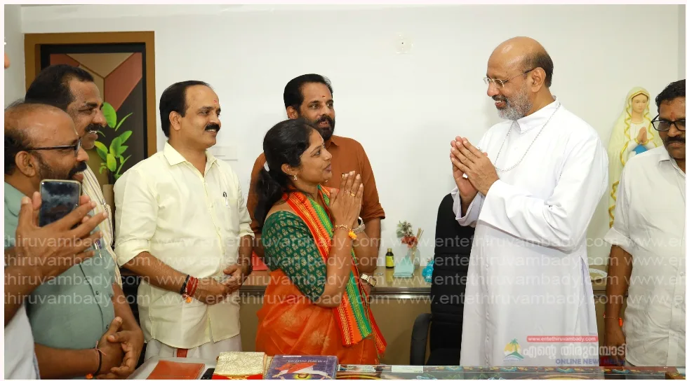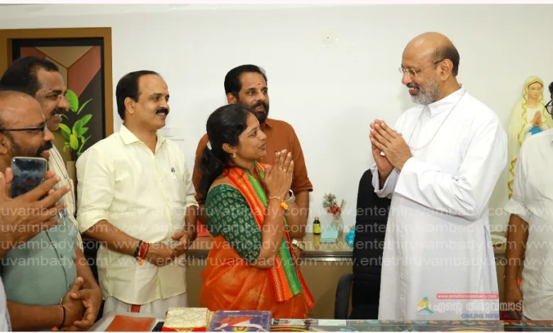 തിരുവമ്പാടി:വയനാട് ലോക്സഭാ മണ്ഡലം എൻ.ഡി.എ സ്ഥാനാർത്ഥി നവ്യാ ഹരിദാസ് താമരശ്ശേരി രൂപതാ ബിഷപ്പ് മാർ റമിഞ്ചിയോസ് ഇഞ്ചനാനിയേലു മായി കൂടിക്കാഴ്ച നടത്തി. തിരുവമ്പാടി പുല്ലൂരാംപാറ ബഥനിയ ധ്യാനകേന്ദ്രത്തിൽ വച്ചായിരുന്നു കൂടിക്കാഴ്ച. തെരഞ്ഞെടുപ്പ് പ്രചാരണത്തിന്റെ ഭാഗമായിട്ടാണ് കൂടിക്കാഴ്ച നടത്തിയത്. തെരഞ്ഞെടുപ്പിൽ ബിഷപ്പിന്റെ പിന്തുണ തേടിയായിരുന്നു കൂടിക്കാഴ്ച. ബിജെപി ജില്ലാ പ്രസിഡൻറ് അഡ്വ.വി കെ സജീവൻ, എൻഡിഎ ജില്ലാ കൺവീനർ ഗിരി പാമ്പനാർ,ബി.ജെ.പി.സംസ്ഥാന വൈസ് പ്രസിഡൻ്റ് വി.വി.രാജൻ, മേഖല സെക്രട്ടറി എൻ പി രാമദാസ്,ജില്ല വൈസ് പ്രസിഡൻ്റ് ടി. ബാലസോമൻ ,മഹിളാമോർച്ച ജില്ലാ പ്രസിഡൻറ് അഡ്വ.രമ്യ മുരളി ,ബിജെപി സംസ്ഥാന കമ്മിറ്റി അംഗങ്ങളായ ഗിരീഷ് തേവള്ളി, പി.രമണീഭായ് , സംസ്ഥാന കൗൺസിൽ അംഗം ഷാൻ കട്ടിപ്പാറ, മണ്ഡലം പ്രസിഡൻറ് ബൈജു കല്ലടിക്കുന്ന്, സജീവ് ജോസഫ്, സവിൻകുമാർ , ഷിനോ കോടഞ്ചേരി, ടി. എ .നാരായണൻ മാസ്റ്റർ, ടി. ശ്രീനിവാസൻ,ശോഭാ സുരേന്ദ്രൻ,സോമിത ശശിധരൻ,ലീന അനിൽ,സംബന്ധിച്ചു