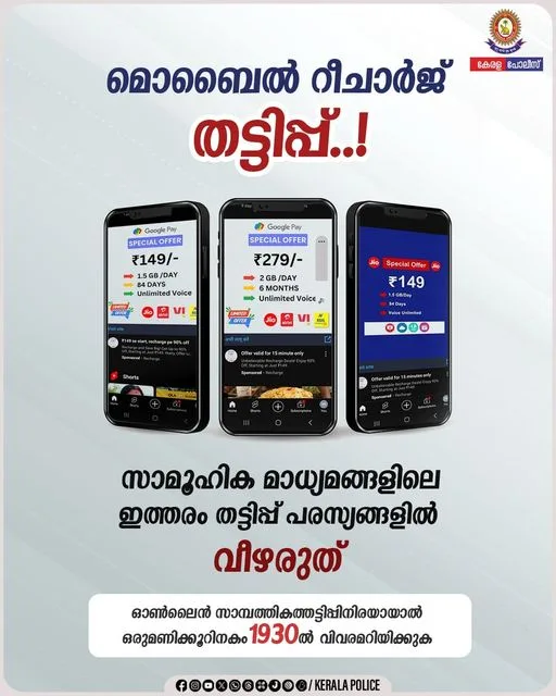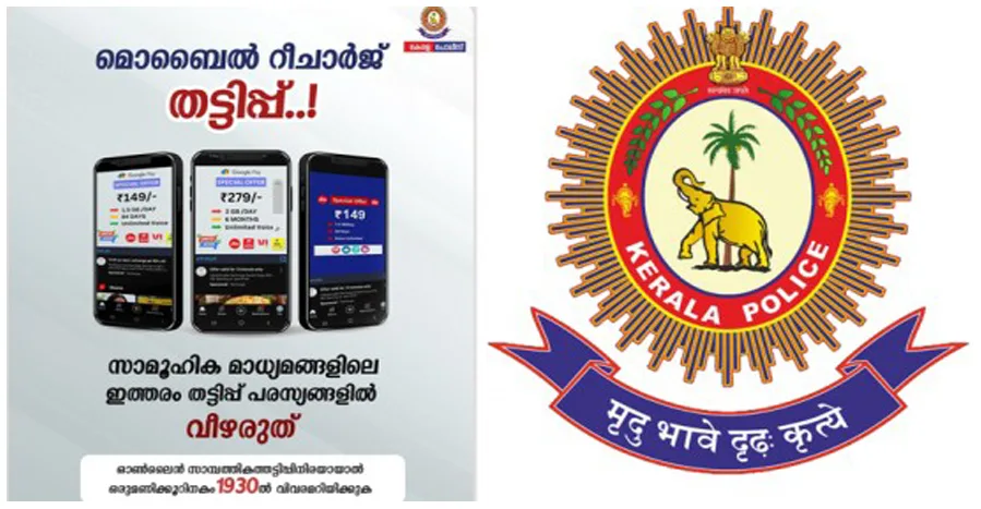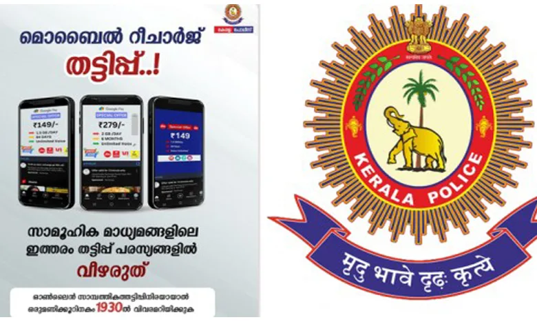 മൊബൈല് ഫോണ് റീചാര്ജിങ് കുറഞ്ഞ നിരക്കില് ലഭിക്കുന്നു എന്ന വ്യാജപ്രചരണം സാമൂഹ്യമാധ്യമങ്ങളിലൂടെ നടക്കുന്നതായി ശ്രദ്ധയില് പെട്ടിട്ടുണ്ടെന്നും ചതിയില് വീഴരുതെന്നും മുന്നറിയിപ്പ് നല്കി കേരള പൊലീസ്.
