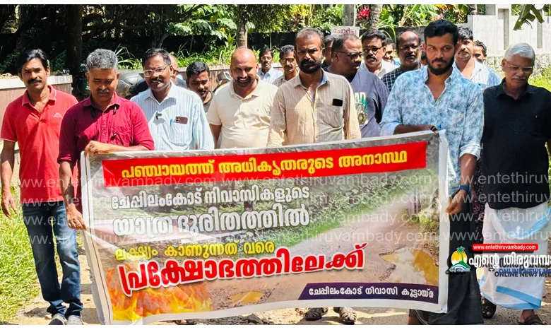 തിരുവമ്പാടി : തിരുവമ്പാടി ചേപ്പിലങ്ങോട് റോഡിൽ മഴപെയ്താൽ കാൽനട പോലും ദുഷ്കരമാകുന്ന സാഹചര്യത്തിൽ ചേപ്പിലങ്ങാട് നിവാസി കൂട്ടായ്മയുടെ നേതൃത്വത്തിൽ പ്രതിഷേധ പ്രകടനം സംഘടിപ്പിച്ചു. നിരവധി തവണ പഞ്ചായത്തിൽ അറിയിച്ചിട്ടും അധികൃതരുടെ ഭാഗത്തുനിന്ന് ഫലം കാണാത്തതിനെ തുടർന്നാണ് പ്രതിഷേധം സംഘടിപ്പിച്ചത്.റോഡിൻ്റെ ശോചനീയാവസ്ഥക്ക് ഉടൻ പരിഹാരം കണ്ടില്ലെങ്കിൽ ആക്ഷൻ കമ്മിറ്റി രൂപീകരിച്ച് ലക്ഷ്യം കാണുന്നത് വരെ പ്രക്ഷോഭം ഒരുക്കാനാണ് നാട്ടുകാരുടെ തീരുമാനം.അതേസമയം മഴ മാറിയാൽ ഉടൻ റോഡ് പൂർണ്ണമായും പൂർവ്വസ്ഥയിലാക്കുമെന്നാണ് അധികൃതർ നൽകുന്ന വിശദീകരണം