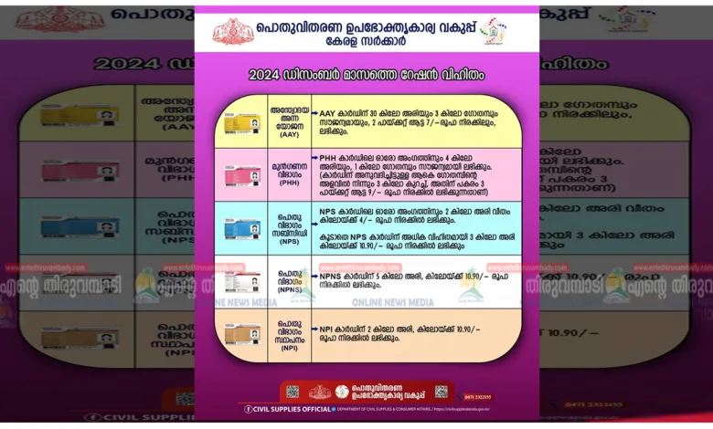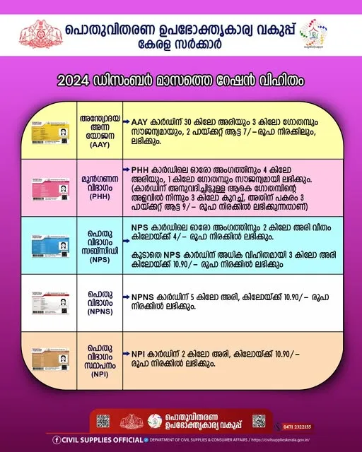 (4) എല്ലാ വിഭാഗം റേഷൻ കാർഡുകൾക്കും അനുവദിച്ചിട്ടുള്ള, 2024 ഡിസംബർ മാസത്തെ റേഷൻ വിഹിതം ചുവടെയുള്ള ചിത്രത്തിൽ ഉൾപ്പെടുത്തിയിരിക്കുന്നു…