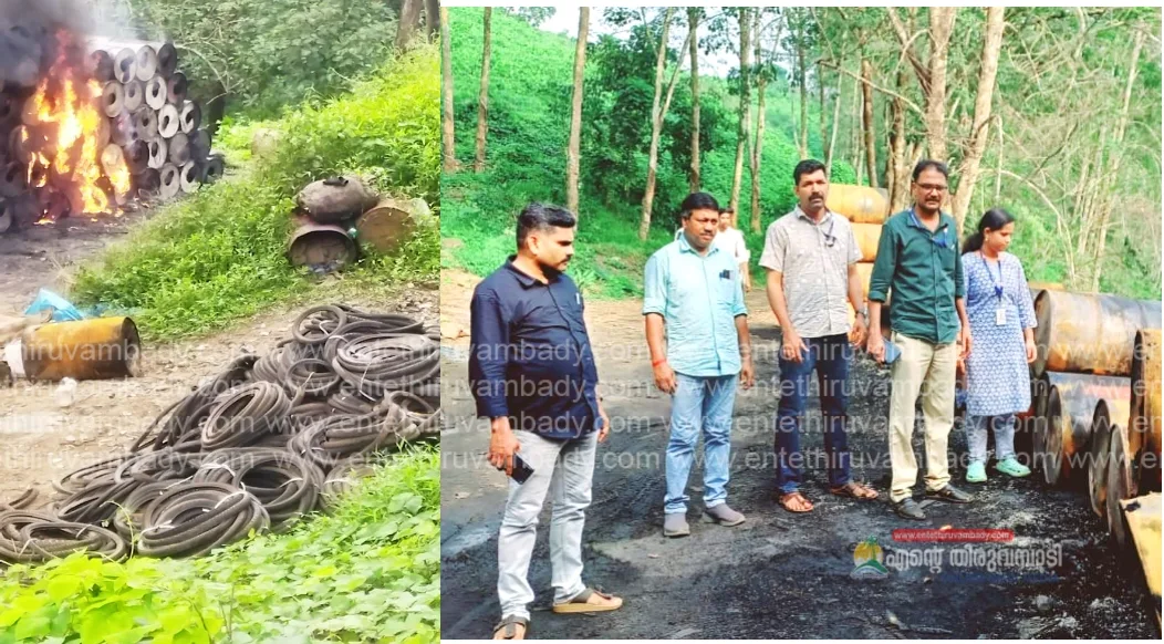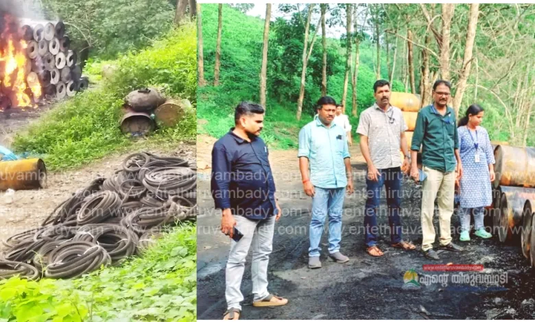 തിരുവമ്പാടി : തിരുവമ്പാടി ഗ്രാമപഞ്ചായത്തിലെ പാറപ്പുറം,വാപ്പാട്ട് തുടങ്ങിയ ജനവാസ മേഖലയോട് ചേർന്ന കൽപ്പൂര് ഭാഗത്ത്കിൽകോത്തഗിരി എസ്റ്റേറ്റിനുള്ളിൽ പൊതുജനാരോഗ്യത്തിന് ഭീഷണിയാകുന്ന തരത്തിൽ ടയറുകൾ കൂട്ടിയിട്ട് കത്തിച്ചതിന് ഗ്രാമ പഞ്ചായത്ത് എൻഫോഴ്സ്മെൻ്റ് സ്ക്വാഡ് 25000 രൂപ പിഴയിട്ടു.ടയറുകൾ കത്തിക്കുമ്പോഴുള്ള ദുർഗന്ധവും കറുത്ത പുകയും അന്തരീക്ഷമലിനീകരണവും ശ്രദ്ധയിൽ പെട്ടതിനെ തുടർന്ന് എസ്റ്റേറ്റ് അധികൃതർക്ക് മുൻപ് ആരോഗ്യവകുപ്പ് നിർദ്ദേശം നൽകിയിരുന്നു, ഇത് ലംഘിച്ചാണ് വീണ്ടും ടയർ കത്തിച്ചത്. എസ്റ്റേറ്റിലെ റബ്ബർ പാൽ കയറ്റി അയക്കാൻ കൊണ്ടുവരുന്ന ഇരുമ്പ് ബാരലുകളിലെ ഓയിൽ അവശിഷ്ടങ്ങൾ ഒഴിവാക്കുന്നതിനായി ശാസ്ത്രീയ മാർഗ്ഗങ്ങൾ സ്വീകരിക്കാതെയാണ് ബാരലുകൾ അട്ടിയിട്ട് അതിൽ ടയറുകൾ തൂക്കിയിട്ട് കത്തിക്കുന്നത്.പരിശോധനയ്ക്ക് ഗ്രാമപഞ്ചായത്ത് എൻഫോഴ്സ്മെന്റ് ടീം അംഗങ്ങളായ ഹെൽത്ത് ഇൻസ്പെക്ടർ എം സുനീർ, ഗ്രാമപഞ്ചായത്ത് ക്ലാർക്ക് ഷർജിത്ത്, ജൂനിയർ ഹെൽത്ത് ഇൻസ്പെക്ടർമാരായ പി പി മുഹമ്മദ് ഷമീർ, കെ ഷാജു , കെ ബി ശ്രീജിത്ത്, മുഹമ്മദ് മുസ്തഫ ഖാൻ, ശരണ്യ ചന്ദ്രൻ എന്നിവർ നേതൃത്വം നൽകി. പാഴ് വസ്തുക്കൾ ഹരിത കർമ്മസേനയ്ക്ക് നൽകാതെയും ശാസ്ത്രീയമായി സംസ്ക്കരിക്കാതെയും വലിച്ചെറിയുകയും കത്തിക്കുകയും ചെയ്യുന്നവർക്കെതിരെ പൊതുജനാരോഗ്യ നിയമപ്രകാരവും പഞ്ചായത്ത് രാജ് ആക്ട് പ്രകാരവും കർശന നിയമ നടപടികൾ സ്വീകരിക്കുമെന്ന് ഗ്രാമപഞ്ചായത്ത് സെക്രട്ടറി കെ എസ്സ് ഷാജുവും മെഡിക്കൽ ഓഫീസർ ഡോ. കെ വി പ്രിയയും അറിയിച്ചു. .