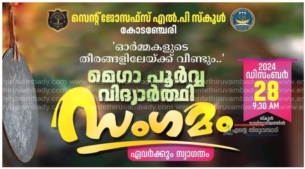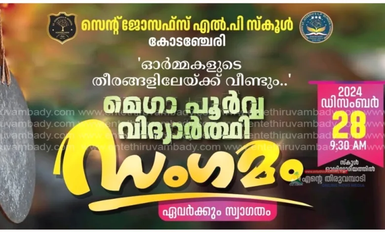 കോടഞ്ചേരി: സെന്റ് ജോസഫ്സ് എൽ.പി സ്കൂളിന്റെ പ്ലാറ്റിനം ജൂബിലിയോട് അനുബന്ധിച്ചുള്ള മെഗാ പൂർവ്വ വിദ്യാർത്ഥി സംഗമം ‘ഓർമ്മയുടെ തീരങ്ങളിലേക്ക് വീണ്ടും..’നാളെ സ്കൂൾ ഓഡിറ്റോറിയത്തിൽ നടക്കും.