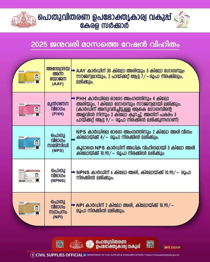 (4) എല്ലാ വിഭാഗം റേഷൻ കാർഡുകൾക്കും അനുവദിച്ചിട്ടുള്ള, 2025 ജനുവരി മാസത്തെ റേഷൻ വിഹിതം ചുവടെയുള്ള ചിത്രത്തിൽ ഉൾപ്പെടുത്തിയിരിക്കുന്നു…