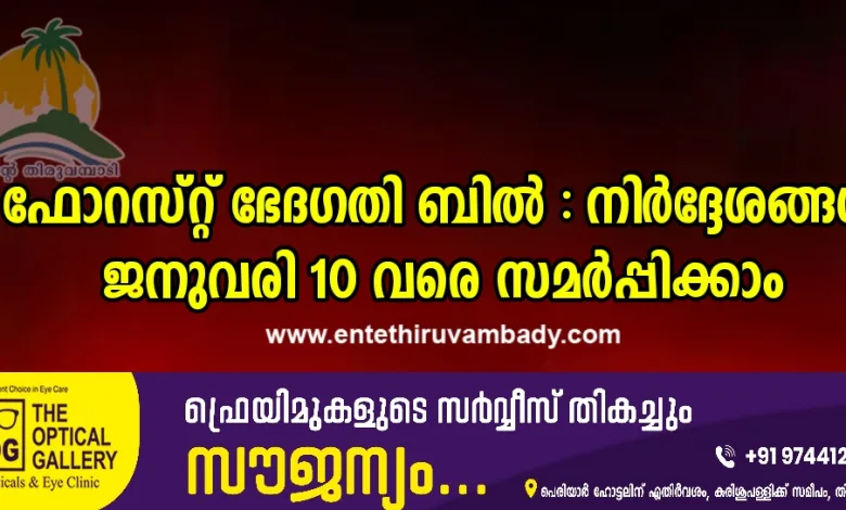 കേരള ഫോറസ്റ്റ് ഭേദഗതി ബിൽ സംബന്ധിച്ച് പൊതുജനങ്ങൾ, സന്നദ്ധ സംഘടനകൾ, നിയമജ്ഞർ തുടങ്ങിയവർക്ക് അഭിപ്രായങ്ങളും നിർദ്ദേശങ്ങളും സർക്കാരിനെ അറിയിക്കാനുള്ള തീയതി ജനുവരി 10 വരെ ദീർഘിപ്പിച്ചതായി വനം -വന്യജീവി വകുപ്പുമന്ത്രി എ.കെ.ശശീന്ദ്രൻ അറിയിച്ചു. 2024 ഡിസംബർ 31-വരെയായിരുന്നു നിർദ്ദേശങ്ങൾ സമർപ്പിക്കാൻ നേരത്തെ നിശ്ചയിച്ചിരുന്ന സമയപരിധി. ബില്ലിന്റെ മലയാളം പകർപ്പ് നിയമസഭയുടെ വെബ്സൈറ്റിൽ ലഭ്യമാകാൻ താമസിച്ചതിനാലാണ് കാലാവധി ദീർഘിപ്പിക്കുന്നത്. നിർദ്ദേശങ്ങൾ വനം-വന്യജീവി വകുപ്പ് അഡീഷണൽ ചീഫ് സെക്രട്ടറിയുടെ താഴെ പറയുന്ന ഔദ്യോഗിക വിലാസത്തിലോ ഇ-മെയിൽ വിലാസത്തിലോ സമർപ്പിക്കാം. ഇപ്പോൾ നിലവിലുള്ള നിയമം മനസ്സിലാക്കിയ ശേഷം ബില്ലിലെ ഭേദഗതികൾ സംബന്ധിച്ച നിർദ്ദേശങ്ങൾ സമർപ്പിക്കേണ്ടതാണ്. പ്രസിദ്ധീകരിച്ച ബിൽ കേരള നിയമസഭയുടെ www.niyamasabha.org വെബ്സൈറ്റിൽ ലഭ്യമാണ്