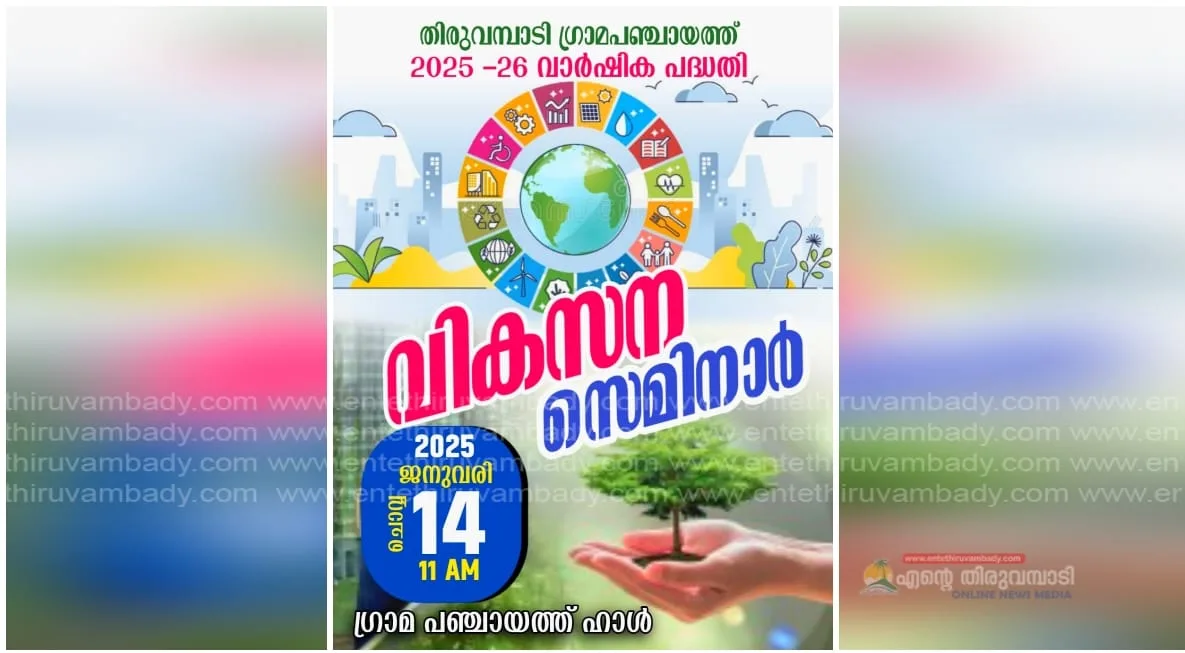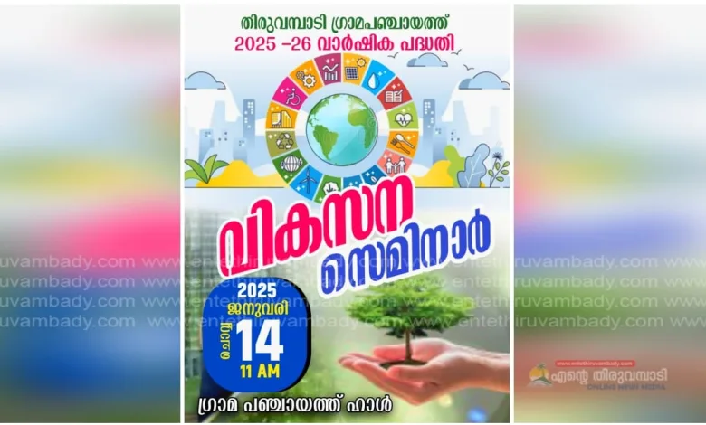 തിരുവമ്പാടി: തിരുവമ്പാടി ഗ്രാമ പഞ്ചായത്ത് 2025-26 വർഷിക പദ്ധതി രൂപീകരണത്തിന്റെ ഭാഗമായി നടക്കുന്ന വികസന സെമിനാർ നാളെ (2025 ജനുവരി 14 ചൊവ്വ) രാവിലെ 11 ന് ഗ്രാമ പഞ്ചായത്ത് ഹാളിൽ നടക്കും. മുഴുവൻ വർക്കിംഗ് ഗ്രൂപ്പ് അംഗങ്ങളും ഗ്രാമസഭകളിൽ നിന്ന് തിരഞ്ഞെടുക്കപ്പെട്ട പ്രതിനിധികളും ആസൂത്രണ സമിതി അംഗങ്ങളും സെമിനാറിൽ പങ്കെടുക്കണമെന്ന് ഗ്രാമപഞ്ചായത്ത് പ്രസിഡന്റ് ബിന്ദു ജോൺസനും, വൈസ് പ്രസിഡന്റ് കെ.എ അബ്ദുറഹിമാനും അറിയിച്ചു.
