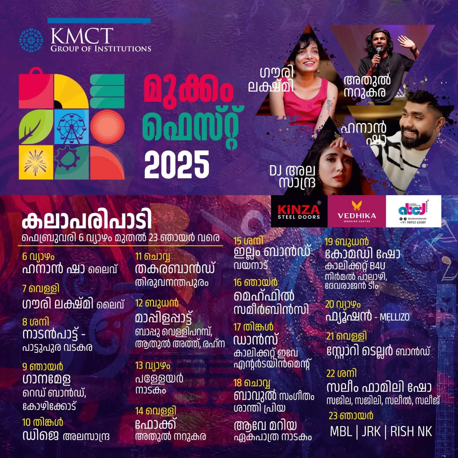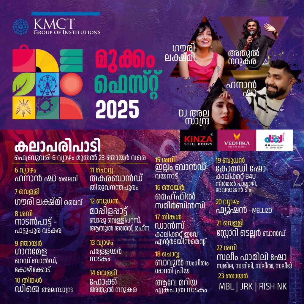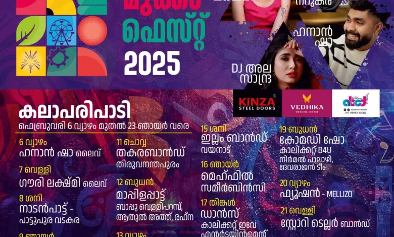 ഗൗരിലക്ഷ്മി സമീർ ബിൻസി, ഹനാൻഷാ, അതുൽ നറുകര, സലീം ഫാമിലി നിർമൽ പാലാഴി, തുടങ്ങി പ്രമുഖ കലാകാരന്മാർ അണിനിരക്കുന്ന കലാപരിപാടികൾ, നാടകങ്ങളും ഫെസ്റ്റിൻ മാറ്റുകൂട്ടും, ഫെസ്റ്റ് ഫെബ്രുവരി 23ന് സമാപിക്കുമെന്നും സംഘാടകർ വർത്താസമ്മേളനത്തിൽ പറഞ്ഞു.