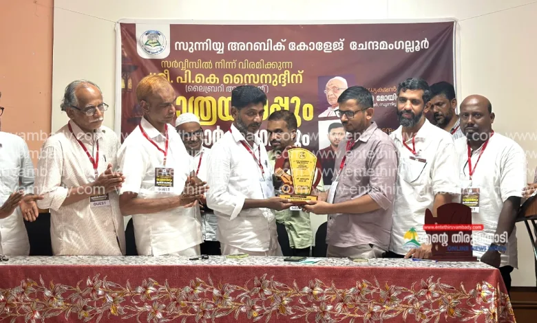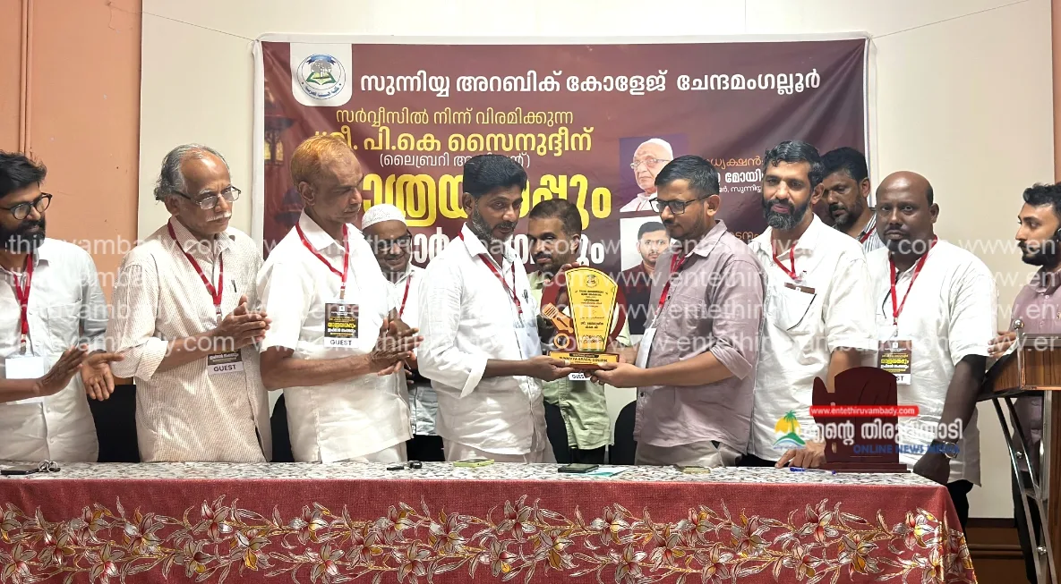 ചേന്ദമംഗലൂർ സുന്നിയ്യ അറബിക് കോളേജിലെ ലൈബ്രറി അസിസ്റ്റന്റ് തസ്തികയിൽ നിന്ന് വിരമിക്കുന്ന പി.കെ സൈനുദ്ദീനുള്ള യാത്രയയപ്പും ഇഫ്താർ സംഗമവും സംഘടിപ്പിച്ചു. കോളേജ് സെമിനാർ ഹാളിൽ നടന്ന ചടങ്ങ് കോളേജിയേറ്റ് എജുക്കേഷൻ സീനിയർ സൂപ്രണ്ട് എം. സുഹൈൽ ഉദ്ഘാടനം ചെയ്തു. മാനേജർ മോയിഹാജി അധ്യക്ഷത വഹിച്ച ചടങ്ങിൽ കാലിക്കറ്റ് യൂണിവേഴ്സിറ്റി സിൻഡിക്കേറ്റ് അംഗം മധു രാമനാട്ടുകര, ജി.എം.യു.പി.സ്കൂൾ ഹെഡ്മാസ്റ്റർ വാസു, മാനേജിംഗ് കമ്മറ്റി പ്രസിഡണ്ട് ഡോ.സി.കെ അഹമ്മദ്, മുൻ പ്രിൻസിപ്പാൾ ഡോ.കെ.കെ.ഇസ്മായിൽ,പ്രൊഫസർ മുഹമ്മദ് ബാക്കൂത്ത്,മുൻ അധ്യാപകൻ ഡോ.മുഹമ്മദ് എം.പി, സ്റ്റാഫ് സെക്രട്ടറി പ്രൊഫസർ പി.പി.അബ്ദുൽ റസാഖ്, അറബിക് വിഭാഗം മേധാവി ഡോ.കെ.എം.അബ്ദുൾ ലത്തീഫ് നദ് വി, കൊമേഴ്സ് വിഭാഗം തലവൻ പി.ടി.ജൈസൽ, ഹെഡ് അക്കൗണ്ടന്റ് എം.പി.അബ്ദുസ്സലിം,ലൈബ്രേറിയൻ ശാദിയ മുഹമ്മദ്,മലയാള വിഭാഗം അധ്യാപകൻ എൻ.ശശികുമാർ, ഇംഗ്ലീഷ് വിഭാഗം അധ്യാപിക ബാസില, ഓഫീസ് പ്രതിനിധി മുഹമ്മദ് ഷാജി,കോളേജ് യൂണിയൻ ചെയർമാൻ നിഹാൽ എന്നിവർ സംസാരിച്ചു. പി.കെ.സൈനുദ്ദീൻ മറുപടി പ്രസംഗം നടത്തി.
