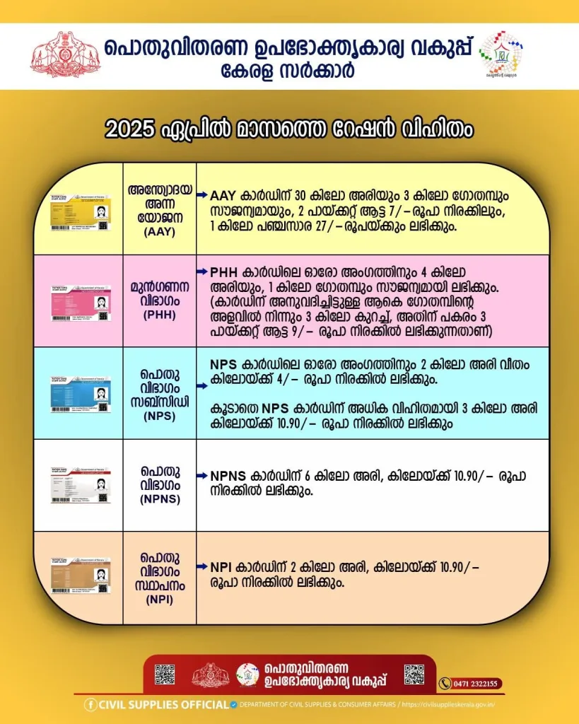 (4) എല്ലാ വിഭാഗം റേഷൻ കാർഡുകൾക്കും അനുവദിച്ചിട്ടുള്ള, 2025 ഏപ്രിൽ മാസത്തെ റേഷൻ വിഹിതം ചുവടെയുള്ള ചിത്രത്തിൽ ഉൾപ്പെടുത്തിയിരിക്കുന്നു…