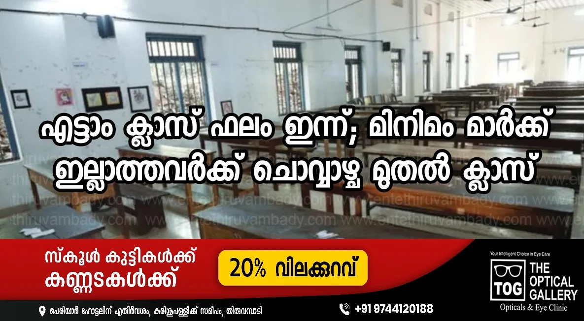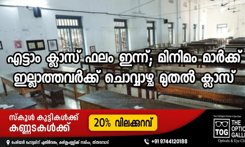 എട്ടാം ക്ലാസ്സില് മിനിമം മാര്ക്ക് ഏര്പ്പെടുത്തിയ ശേഷമുള്ള ആദ്യ പരീക്ഷാഫലം ഇന്ന് സ്കൂളുകളില് പ്രസിദ്ധീകരിക്കും. ഓരോ വിഷയത്തിലും 30 ശതമാനം ആണ് മിനിമം മാര്ക്ക്. യോഗ്യതാ മാര്ക്ക് ലഭിക്കാത്ത കുട്ടികളുടെ രക്ഷിതാക്കളെ തിങ്കളാഴ്ച സ്കൂളില് വിളിച്ചുവരുത്തി അധ്യാപക രക്ഷാകര്ത്തൃയോഗം ചേര്ന്ന് കാര്യങ്ങള് ബോധ്യപ്പെടുത്തണം. ഈ കുട്ടികള്ക്ക് എട്ടാംതീയതി മുതല് 24 വരെ പ്രത്യേകം ക്ലാസുകള് നല്കും.