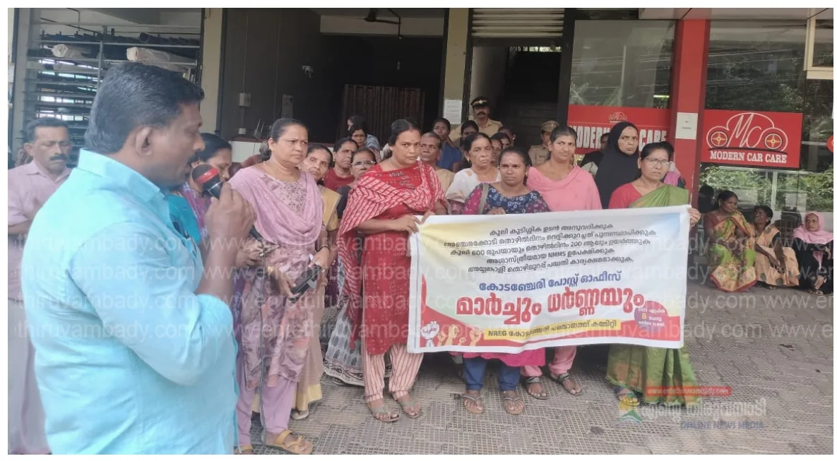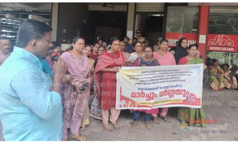 എന്നി മുദ്രാവാക്യങ്ങൾ ഉയർത്തി എൻ ആർ ഇ ജി വർക്കേഴ്സ് യൂണിയൻ്റെ നേതൃത്വത്തിൽ കോടഞ്ചേരി പോസ്റ്റോഫീസിന് മുൻപിൽ മാർച്ചും ധർണ്ണയും നടത്തി.