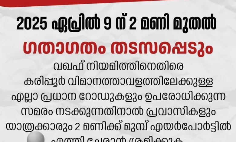 ഇന്ന് (2025 ഏപ്രിൽ 9 ബുധൻ) ഉച്ചക്ക് 2 മണി മുതൽ കരിപ്പൂർ എയർപോർട്ടിലേക്ക് ഉള്ള ഗതാഗതം തടസപ്പെടും.