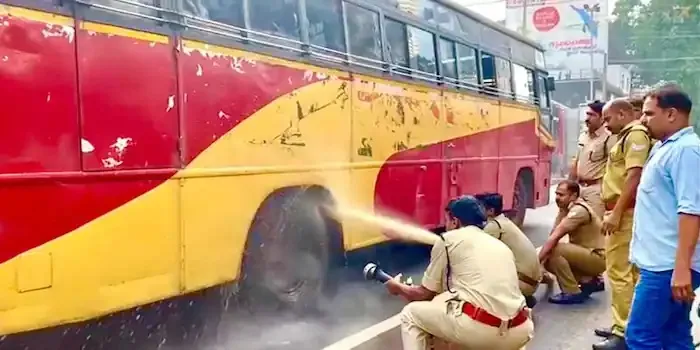 മുക്കം: ഓടിക്കൊണ്ടിരിക്കുകയായിരുന്ന കെ എസ് ആര് ടി സി ബസ്സിന്റെ ടയറിന് തീപിടിച്ചു. ഇന്ന് രാവിലെ 7.45ഓടെ മുക്കം പൊലീസ് സ്റ്റേഷന് സമീപത്ത് വെച്ചാണ് അപകടം ഉണ്ടായത്.താമരശ്ശേരിയില് നിന്നും എറണാകുളം ഭാഗത്തേക്ക് പോകുകയായിരുന്ന ബസ്സിനാണ് തീപിടിച്ചത്. ബസ്സിന്റെ ഡ്രൈവറുടെ വശത്തുള്ള പുറകിലെ ടയറില് നിന്ന് പുക ഉയരുന്നത് കണ്ട് പെട്ടെന്ന് ബസ് നിര്ത്തുകയായിരുന്നു. മുക്കം അഗ്നിരക്ഷാസേനയും പോലീസും സ്ഥലത്തെത്തി തീയണച്ചു. യാത്രക്കാര് എല്ലാവരും സുരക്ഷിതരാണെന്ന് അധികൃതര് അറിയിച്ചു. തീപിടിക്കാനിടയായ സാഹചര്യം എന്താണെന്ന് വ്യക്തമായിട്ടില്ല.