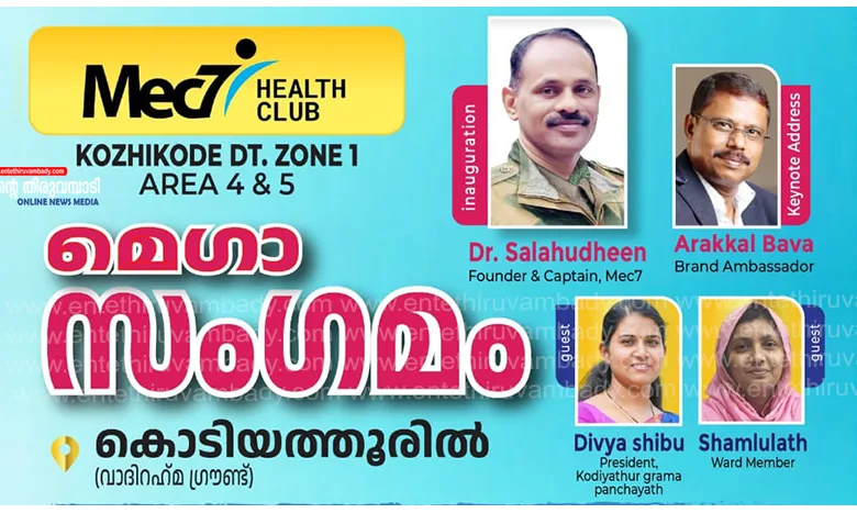 കൊടിയത്തൂർ : ശാരീരികവും മാനസികവും സാമൂഹികവുമായ ആരോഗ്യം ലക്ഷ്യമിടുന്ന മെക് 7 സൗജന്യ വ്യായാമപദ്ധതിയിലെ അംഗങ്ങളുടെ മേഖലാ മെഗാസംഗമം നാളെ കൊടിയത്തൂർ വാദിറഹ്മ മൈതാനിയിൽ നടക്കുമെന്ന് സംഘാടകർ പത്രസമ്മേളനത്തിൽ അറിയിച്ചു. ഓരോപ്രദേശത്തെയും എല്ലാവിഭാഗം ആളുകളും നിത്യവും പുലർച്ചെ ഒരുമിച്ചുചേരുന്ന വ്യായാമമുറ സമൂഹത്തിൽ ഐക്യം ശക്തിപ്പെടുത്താൻ ഏറെ സഹായിക്കുന്നതാണ്. മെക് 7 ഹെൽത്ത് ക്ലബ് സോൺ വണ്ണിലെ നാല്, അഞ്ച് ഏരിയയിൽപ്പെട്ട 50-ഓളം യൂണിറ്റുകളിൽനിന്നുള്ള 2500 അംഗങ്ങളാണ് മെഗാസംഗമത്തിൽ പങ്കെടുക്കുന്നത്.
