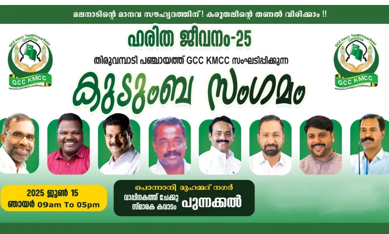 തിരുവമ്പാടി: മലനാടിൻ്റെ മാനവ സൗഹൃദത്തിന് സൗഹൃദത്തിൻ്റെ കരുതൽ എന്ന സന്ദേശം ഉയർത്തി പിടിച്ച് തിരുവമ്പാടി പഞ്ചായത്ത് ജി.സി.സി കെ.എം.സി.സി സംഘടിപ്പിക്കുന്ന കുടുംബ സംഗമം നാളെ (ഞായർ) രാവിലെ 10 മണിക്ക് പുന്നക്കൽ പാരീഷ് ഹാളിൽ നടക്കും. പരിപാടിയുടെ ഭാഗമായി സാംസ്കാരിക സമ്മേളനം, മാജിക് ഷോ, കലാവിരുന്ന് എന്നിവ നടക്കും.ഉച്ചയ്ക്ക് ശേഷം 2 മണിക്ക് പ്രശസ്ത ഗായകനും മോട്ടിവേഷൻ സ്പീക്കറുമായ നവാസ് പാലേരി ‘സൗഹൃദം പൂക്കുന്ന കുടുംബമാണ് ലഹരി ‘ എന്ന വിഷയത്തിൽ ക്ലാസ്സെടുക്കും. പരിപാടിയിൽ സാമൂഹിക-രാഷ്ട്രീയ-സാംസ്കാരിക നേതാക്കൾ സംബന്ധിക്കുമെന്നും പോഗ്രാം കമ്മിറ്റി ചെയർമാൻ വാപ്പിനകത്ത് മൊയ്തീൻ അറിയിച്ചു.