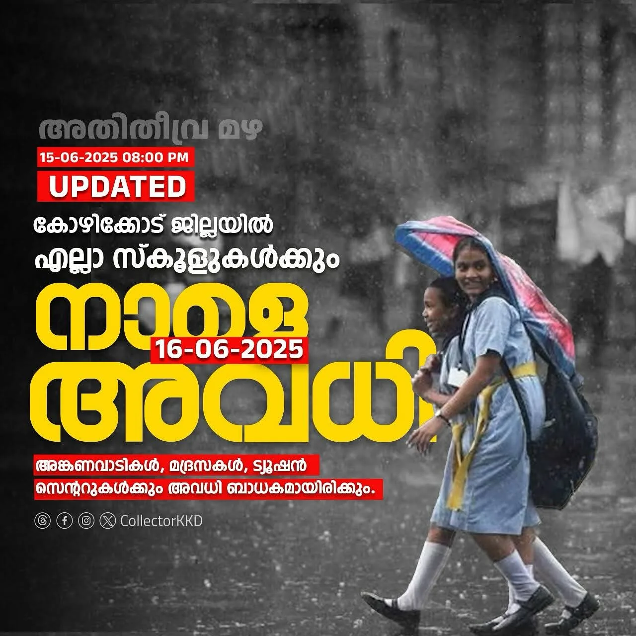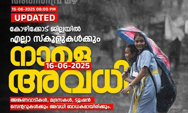 കോഴിക്കോട് ജില്ലയില് റെഡ് അലര്ട്ട് പ്രഖ്യാപിച്ച സാഹചര്യത്തില് കോഴിക്കോട് ജില്ലയിലെ സ്കൂളുകള്ക്ക് നാളെ (ജൂൺ 16 തിങ്കളാഴ്ച) ജില്ലാ കലക്ടർ അവധി പ്രഖ്യാപിച്ചു. അങ്കണവാടികള്, മദ്രസകള്, ട്യൂഷന് സെന്ററുകള് തുടങ്ങിയവയ്ക്കും അവധി ബാധകമായിരിക്കും.