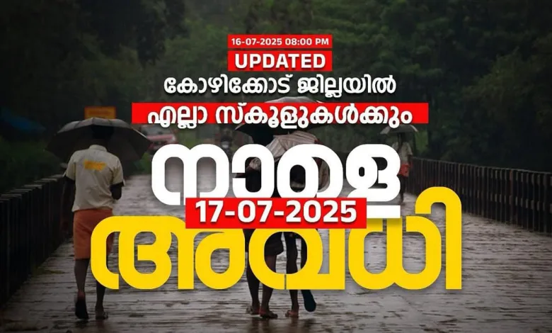 കോഴിക്കോട് ജില്ലയില് ശക്തമായ മഴ മുന്നറിയിപ്പുള്ള സാഹചര്യത്തില് നാളെ (ജൂലൈ 17 വ്യാഴാഴ്ച) സ്കൂളുകള്ക്ക് അവധിയാണ്. അങ്കണവാടികള്, മദ്രസകള്, ട്യൂഷന് സെന്ററുകള് തുടങ്ങിയവയ്ക്കും അവധി ബാധകമായിരിക്കുമെന്ന് കോഴിക്കോട് ജില്ലാ കലക്ടർ അറിയിച്ചു.