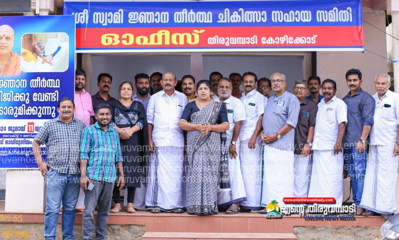 തിരുവമ്പാടി മലയോര നാടിൻ്റെ സാഹോദര്യത്തിൻ്റെയും സൗഹൃദത്തിൻ്റെയും മനുഷ്യ സ്നേഹത്തിൻ്റെയും സുന്ദരമുഖവും, പ്രതീകവുമായ സ്വാമി ജ്ഞാന തീർത്ഥയുടെ ചികിൽസ സഹായ സമാഹരണത്തിൻ്റെ പ്രവർത്തനങ്ങൾക്കായുള്ള ഓഫീസ് തിരുവമ്പാടി ഗ്രാമപഞ്ചായത്ത് പ്രസിഡണ്ട് ബിന്ദു ജോൺസൺ ഉൽഘാടനം ചെയ്തു. ചികിൽസ സഹായ സമിതി ചെയർമാൻ അബൂബക്കർ മൗലവി അധ്യക്ഷത വഹിച്ച യോഗത്തിൽ ചികിൽസ സഹായ സമിതി വർക്കിങ് ചെയർമാൻ ബാബു പൈക്കാട്ടിൽ, ജില്ലാപഞ്ചായത്ത് മെമ്പർ ബോസ് ജേക്കബ്, പഞ്ചായത്ത് സ്റ്റാൻ്റിങ് കമ്മറ്റി ചെയർപേഴ്സൺ ലിസി മാളിയേക്കൽ, പഞ്ചായത്ത് മെമ്പർ രാമചന്ദ്രൻ കരിമ്പിൽ, ജനറൽ കൺവീനർ സുന്ദരൻ എ പ്രണവം, ചികിൽസ സഹായ സമിതി ഭാരവാഹികളായ ഗിരി പാമ്പനാൽ, പി.എ.ശ്രീധരൻ, ഷാജി ആലക്കൽ, പി.സി. മെവിൻ, വി.സി.മൊയ്തീൻ കോയ, പി.എസ്.റിയാസ്, കെ.പി. രമേഷ്, സി.ജി.ഭാസി, ജയൻ അറു കാക്കൽ, പി.കെ.സജീവ്, എം.ആർ.ബാബു, പി.എസ് സലി മോൻ എന്നിവർ സംസാരിച്ചു.