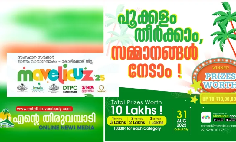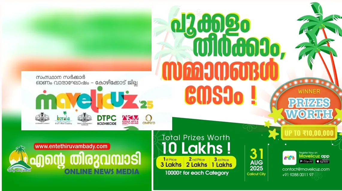 കോഴിക്കോട്:സംസ്ഥാന സര്ക്കാരിന്റെ ഓണാഘോഷം മാവേലിക്കസ് 2025നോടനുബന്ധിച്ച് നടത്തുന്ന മെഗാ പൂക്കളമത്സരത്തില് പങ്കെടുക്കൻ ഓഗസ്റ്റ് 28 വരെ സൗജന്യമായി രജിസ്റ്റർ ചെയ്യാം. ഓഗസ്റ്റ് 31-ന് നഗര പരിധിയിലെ നൂറോളം വേദികളിൽ വിവിധ വിഭാഗങ്ങളിലായി നടക്കുന്ന മത്സരത്തിൽ ആകെ 10 ലക്ഷം രൂപയുടെ സമ്മാനങ്ങളാണ് വിജയികളെ കാത്തിരിക്കുന്നത്.