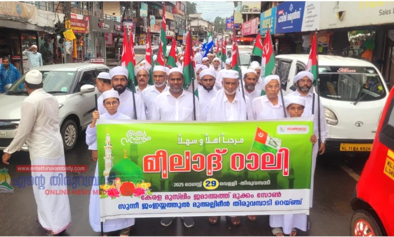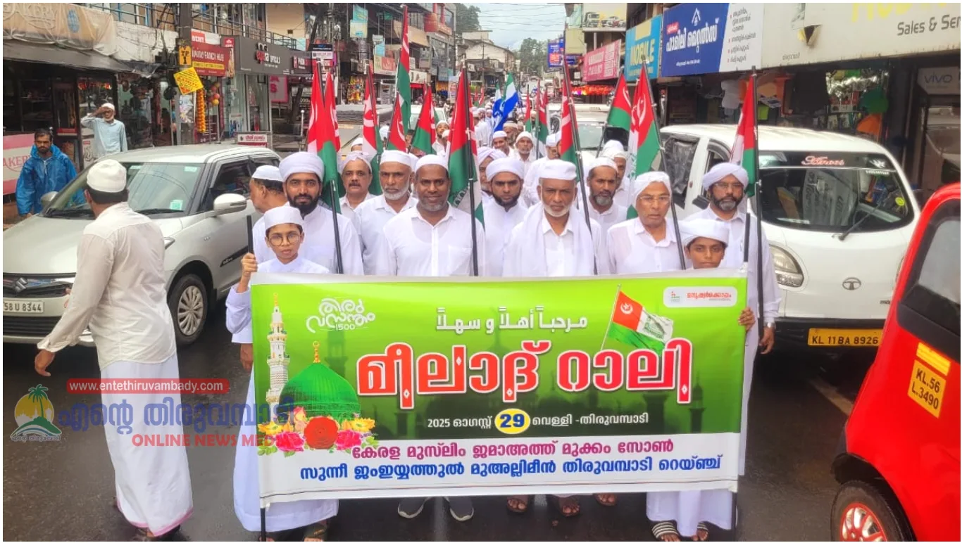 തിരുവമ്പാടി :കേരള മുസ്ലിം ജമാഅത്ത് മുക്കം സോൺ കമ്മിറ്റിയും തിരുവമ്പാടി റൈഞ്ച് ജംഇയ്യത്തുൽ മുഅല്ലിമീനും സംയുക്തമായി തിരുവമ്പാടി യിൽ മീലാദ് റാലി സംഘടിപ്പിച്ചുതാഴെ തിരുവമ്പാടിയിൽ നിന്ന് ആരംഭിച്ച റാലി ബസ്സ് സ്റ്റാൻ്റിൽ സമാപിച്ചു. സി.കെ.ശമീർ മാസ്റ്റർ, നാസർ സഖാഫി കരീറ്റിപ്പറമ്പ് ,കെ .ടി.ഹാരിസ് സഖാഫി താഴെ തിരുവമ്പാടിഅബ്ദുൽ ഹമീദ്’ എം.പി.ബഷീർ ഹാജി ,അസ്ഹർ സഖാഫി പൂളപ്പൊയിൽ, അസീസ് കൊടിയത്തൂർ ,അബ്ദുസ്സലാം മുസ്ലിയാർ പുന്നക്കൽ, ശിഹാബുദ്ധീൻ ഹിശാമി , ലത്തീഫ് സഖാഫി തിരുവമ്പാടി,ഹാഫിള് സുഫിയാൻ സഖാഫി , ശാഹിദ് അദനി ,അബ്ദുൽ കരീം വാലയിൽ എന്നിവർ നേതൃത്വം നൽകി.സമാപന സംഗമത്തിൽ സൈനുൽ ആബിദീൻ സഅദി പ്രാർത്ഥന നിർവഹിച്ചു. കെ ടി അബ്ദുൽ ജബ്ബാർ സഖാഫി അധ്യക്ഷം വഹിച്ചു.ജഅഫർ സ്വാദിഖ് സഖാഫി തെച്ചാട്പ്രമേയ പ്രഭാഷണം നടത്തി.സുൽഫിക്കർ അലി സഖാഫി, മൂസ മാസ്റ്റർ തിരുവമ്പാടി എന്നിവർ സംബന്ധിച്ചു