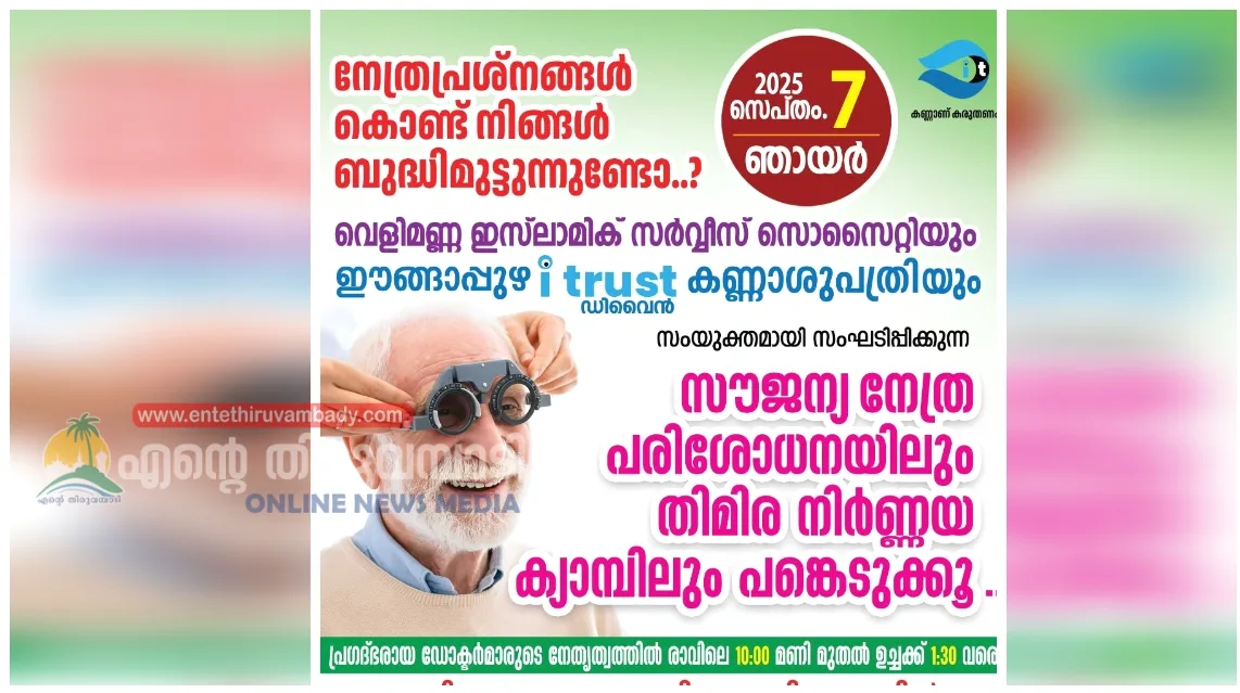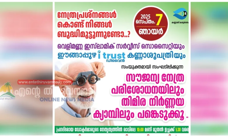 സൗജന്യ നേത്ര പരിശോധന തിമിര നിർണ്ണയ ക്യാമ്പ് നാളെ വെളിമണ്ണ സിഎംവിഎം മുഹമ്മദിയ്യ സുന്നിമദ്രസയിൽ നടക്കും.