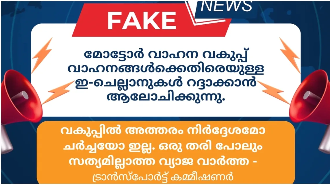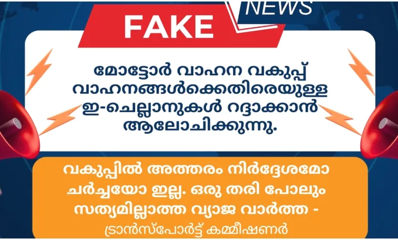ഇ-ചലാൻ റദ്ദാക്കാൻ ആലോചിക്കുന്നതായി വ്യാജ വ്യാജ വാർത്തകൾ പ്രചരിക്കുന്നു:മോട്ടോർ വാഹന വകുപ്പ്