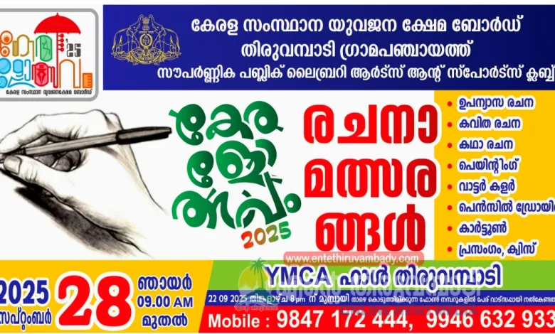 27-09-2025 ന് ശനിയാഴ്ച ഉച്ചകഴിഞ്ഞ് 2 മണി മുതൽ തിരുവമ്പാടി പഞ്ചായത്ത് ഹാളിൽ വച്ച് ചെസ്സ് മത്സരം സംഘടിപ്പിക്കുന്നു. 28-09-2025 ന് ഞായറാഴ്ച രാവിലെ 9 മണി മുതൽ തിരുവമ്പാടി വൈ എം സി എ ഹാളിൽ വച്ച് രചന മത്സരങ്ങൾ ആയ കഥാരചന, കവിത രചന, പെൻസിൽ ഡ്രോയിങ്, ഉപന്യാസരചന, കാർട്ടൂൺ, പ്രസംഗം, ക്വിസ് എന്നിവ സംഘടിപ്പിക്കുന്നു. മത്സരത്തിൽ പങ്കെടുക്കാൻ താല്പര്യപ്പെടുന്നവർ 22-09-2025 ന് മുൻപായി സൗപർണിക പബ്ലിക് ലൈബ്രറിയിലോ, തിരുവമ്പാടി ഗ്രാമ പഞ്ചായത്തിലോ, തിരുവമ്പാടി എസ് ബി ഐക്ക് മുൻപിലുള്ള റെയിൻബോ ഫാൻസി ആൻഡ് സ്റ്റേഷനറി ഷോപ്പിലോ അപേക്ഷ നൽകേണ്ടതാണ്. അന്വേഷണങ്ങൾക്ക് 9847172444,9946632933