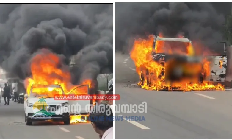 ആര്ക്കും പരിക്കേറ്റിട്ടില്ല. വൈകീട്ട് നാലുമണിയോടെയാണ് സംഭവം. അഗ്നിശമനസേനയെത്തി തീയണച്ചപ്പോഴേക്കും കാര് പൂര്ണ്ണമായും കത്തിനശിച്ചു. ഹൈദരാബാദ് സ്വദേശികള് കാര് കോഴിക്കോട് നിന്ന് റെന്റിന് എടുത്തതാണെന്നാണ് വിവരം. പുകയും മണവും വന്നതിനെ തുടര്ന്ന് ഇവര് പുറത്തിറങ്ങുകയായിരുന്നു.