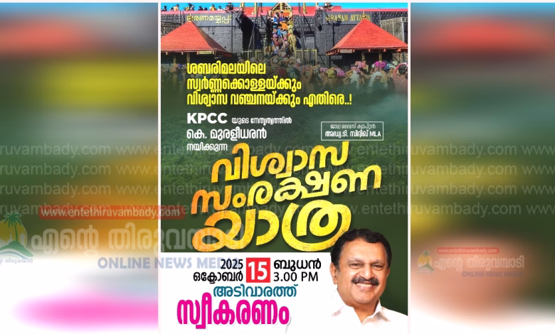 അടിവാരം :ശബരിമലയിലെ സ്വർണക്കൊള്ളയ്ക്കും വിശ്വാസവഞ്ചനക്കുമെതിരെ കെപിസിസിയുടെ നേതൃത്വത്തിൽ കെ. മുരളീധരൻ നയിക്കുന്ന വിശ്വാസ സംരക്ഷണ യാത്ര നാളെ (ഒക്ടോബർ 15) 3:00 മണിക്ക് അടിവാരത്ത് സ്വീകരണം ഒരുക്കുന്നു.