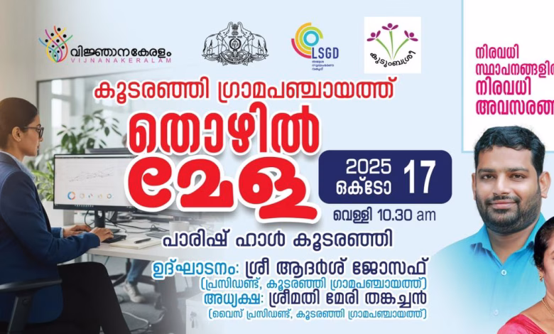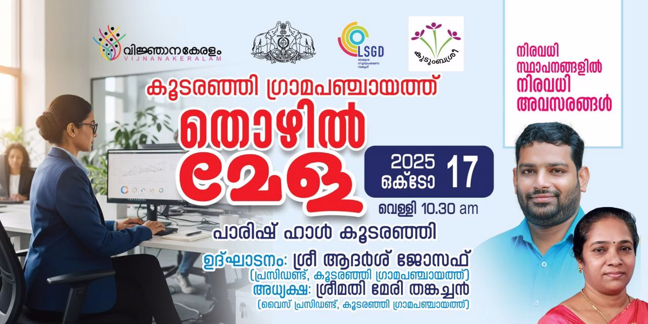 വിജ്ഞാനകേരളം തൊഴിൽമേളയിൽ തൊഴിൽ രഹിതരായ നമ്മുടെ പഞ്ചായത്തിലെ യുവതി യുവാക്കൾക്ക് പങ്കെടുക്കാം.