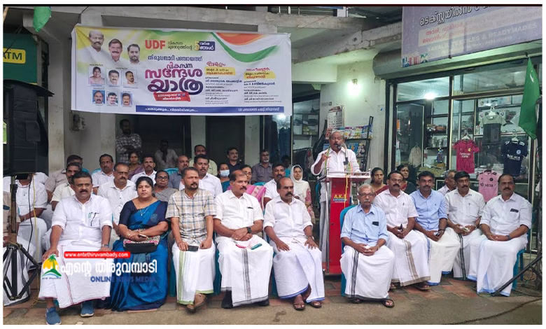 27-10-2025 തിങ്കളാഴ്ച രാവിലെ 9.00 മണിക്ക് മുത്തപ്പൻപുഴയിൽ നിന്നും പ്രയാണം ആരംഭിക്കുന്ന യൂഡിഎഫ് വികസന സന്ദേശ യാത്ര പത്തൊൻപത് വാർഡുകളിലും സ്വീകരണ കേന്ദ്രങ്ങൾ പിന്നിട്ട് വെകു: 5.00 മണിക്ക് തിരുവമ്പാടി ബെസ്റ്റാൻ്റ് പരിസരത്ത് സമാപിക്കും. ഡിസിസി പ്രസിഡൻ്റ് അഡ്വ: കെ പ്രവീൺ കുമാർ ഉദ്ഘടനം ചെയ്യും. മുസ്സിം ലീഗ് തിരുവമ്പാടി നിയോജക മണ്ഡലം പ്രസിഡൻ്റ് സി.കെ കാസിം, കേരളാ കോൺഗ്രസ് യൂത്ത് ഫ്രണ്ട് സംസ്ഥാന സെക്രട്ടറി ഷിനോയി അടക്കാപ്പാറ മുഖ്യപ്രഭാഷണം നടത്തും.