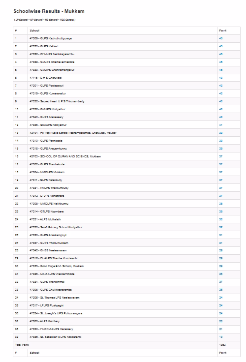 ഹൈസ്കൂൾ വിഭാഗം 270. നേടി പിടിഎംഎച്ച്എസ്എസ് കൊടിയത്തൂരും,238 പോയൻ്റ് നേടി ചേന്നമംഗലൂർ ഹൈസ്കൂളും 237 പോയിന്റ് നേടി സേക്രഡ് ഹാർട്ട് ഹൈസ്കൂളും ചാമ്പ്യന്മാരായി.