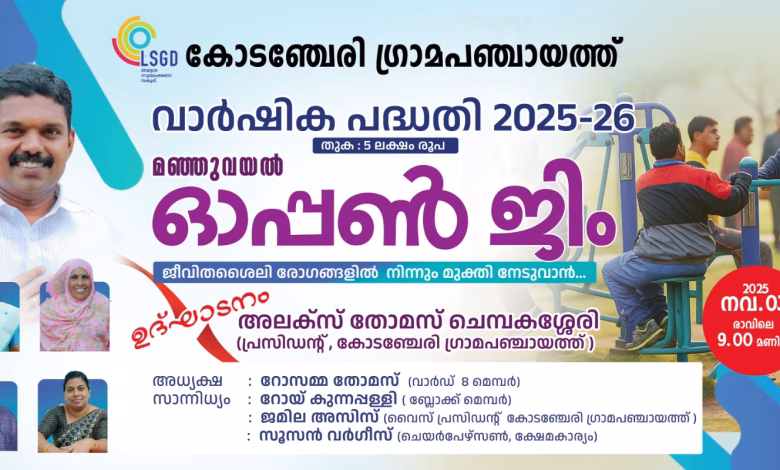 5 ലക്ഷം രൂപ ചെലവഴിച്ചു പൂര്ത്തീകരിച്ച മഞ്ഞുവയൽ ഓപ്പൺ ജിമ്മിന്റെ ഉദ്ഘാടനം നാളെ രാവിലെ 9ന് ഗ്രാമപഞ്ചായത്ത് പ്രസിഡണ്ട് അലക്സ് തോമസ് നിർവഹിക്കും.