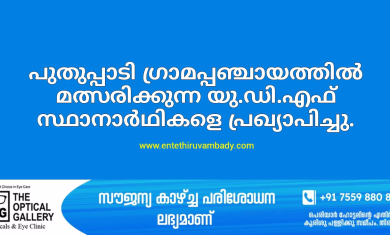 തദ്ദേശസ്വയംഭരണ തിരഞ്ഞെടുപ്പിൽ പുതുപ്പാടി ഗ്രാമപ്പഞ്ചായത്തിൽ മത്സരിക്കുന്ന യു.ഡി.എഫ് സ്ഥാനാർഥികളെ പ്രഖ്യാപിച്ചു.