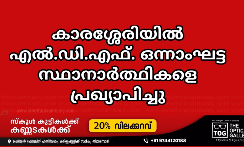 മുക്കം:തദ്ദേശ തിരഞ്ഞെടുപ്പിലേക്ക് മത്സരിക്കുന്ന കാരശ്ശേരി ഗ്രാമപഞ്ചായത്ത് സ്ഥാനാർത്ഥികളെ പ്രഖ്യാപിച്ച് എൽ.ഡി.എഫ്. പുതുമുഖങ്ങളും മുൻ മെമ്പർമാരുമുൾപ്പെടെയുള്ള സ്ഥാനാർത്ഥികളെ അണിനിരത്തിയാണ് എൽ.ഡി.എഫ്. മത്സര രംഗത്തിറങ്ങുന്നത്. 20വാർഡുകളുളള പഞ്ചായത്തിലെ 15 ഇടങ്ങളിലെ സ്ഥാനാർത്ഥികളെയാണ് ആദ്യഘട്ടത്തിൽ പ്രഖ്യാപിച്ചത്.