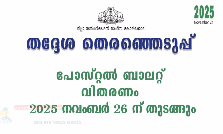 അപേക്ഷകൾ ലഭിക്കുന്ന മുറയ്ക്ക് തിരഞ്ഞെടുപ്പ് ഡ്യൂട്ടിയിലുള്ള സമ്മതിദായകർക്കുള്ള പോസ്റ്റൽ ബാലറ്റ് വിതരണം നവംബർ 26 മുതൽ ആരംഭിക്കുമെന്ന് ജില്ലാ കലക്ടർ സ്നേഹിൽ കുമാർ സിംഗ് അറിയിച്ചു. തിരഞ്ഞെടുപ്പ് ഡ്യൂട്ടിയിൽ ഏർപ്പെടുന്ന ജീവനക്കാരെ അവരുടെ ഡ്യൂട്ടി നിർവചിച്ചും അതിലേക്ക് നിയോഗിച്ചും കൊണ്ട് ബന്ധപ്പെട്ട ജില്ലാ തിരഞ്ഞെടുപ്പ് ഉദ്യോഗസ്ഥർ, ജില്ലാ പോലീസ് മേധാവികൾ, വരണാധികാരികൾ, ഉപവരണാധികാരികൾ എന്നിവർ യഥാസമയം ഉത്തരവ് പുറപ്പെടുവിക്കണമെന്ന് സംസ്ഥാന തിരഞ്ഞെടുപ്പ് കമ്മീഷൻ നിർദ്ദേശിച്ചു.