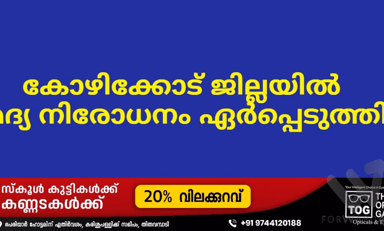 കോഴിക്കോട് :തദ്ദേശ തിരഞ്ഞെടുപ്പിന്റെ പശ്ചാത്തലത്തില്‍ ജില്ലയില്‍ വോട്ടെടുപ്പ് അവസാനിക്കുന്നതിന് തൊട്ടുമുമ്പുള്ള 48 മണിക്കൂര്‍ സമയത്തേക്കും വോട്ടെണ്ണല്‍ ദിവസമായ ഡിസംബര്‍ 13നും മദ്യ നിരോധനം ഏര്‍പ്പെടുത്തി ജില്ലാ കലക്ടര്‍ ഉത്തരവിട്ടു. ഡിസംബര്‍ ഒമ്പതിന് വൈകിട്ട് ആറു മുതല്‍ വോട്ടെടുപ്പ് ദിനമായ ഡിസംബര്‍ 11ന് വൈകുന്നേരം ആറു വരെയും വോട്ടെണ്ണല്‍ ദിനമായ ഡിസംബര്‍ 13നുമാണ് മദ്യ നിരോധനം.
