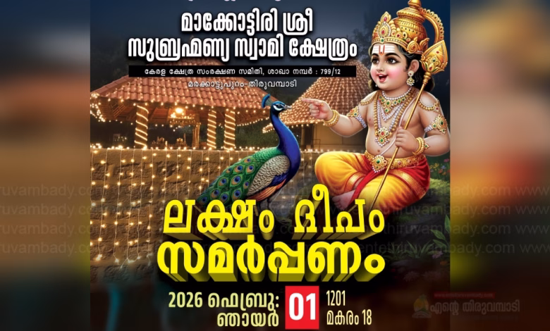 തിരുവമ്പാടി :തൊണ്ടിമ്മൽ, മരക്കാട്ടുപുറം മാക്കോട്ടിരി ശ്രീ സുബ്രഹ്മണ്യസ്വാമി ക്ഷേത്രത്തിൽ ലക്ഷം ദീപം സമർപ്പണം നാളെ (ഫെബ്രുവരി 1) നടക്കും.